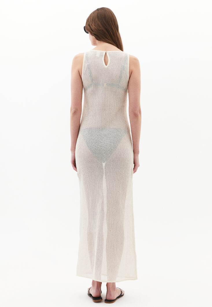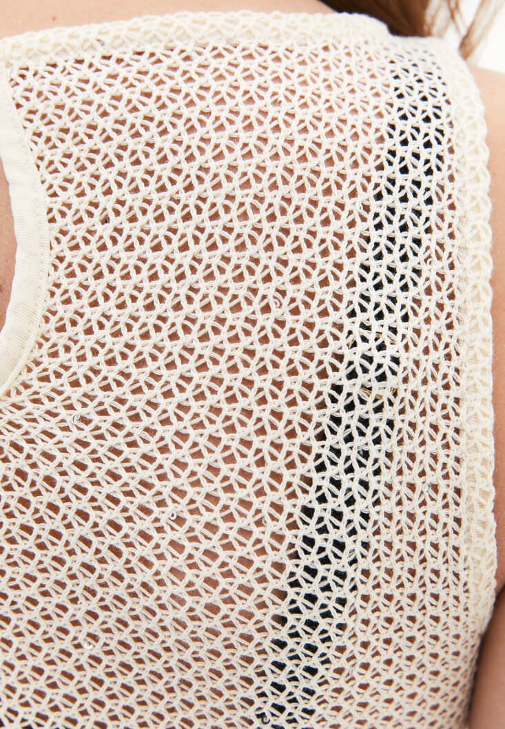 Pamuk karışımlı file doku, bot yaka, uzun kesim, bedene yakın rahat fit, kolsuz kesim.