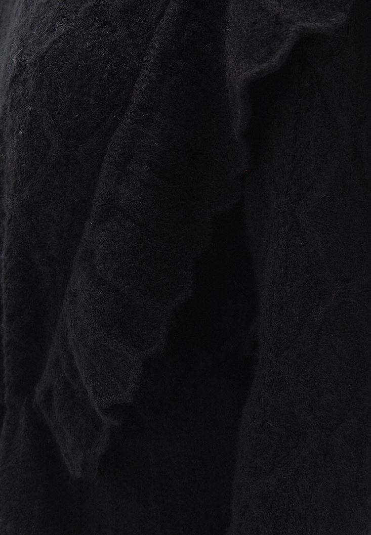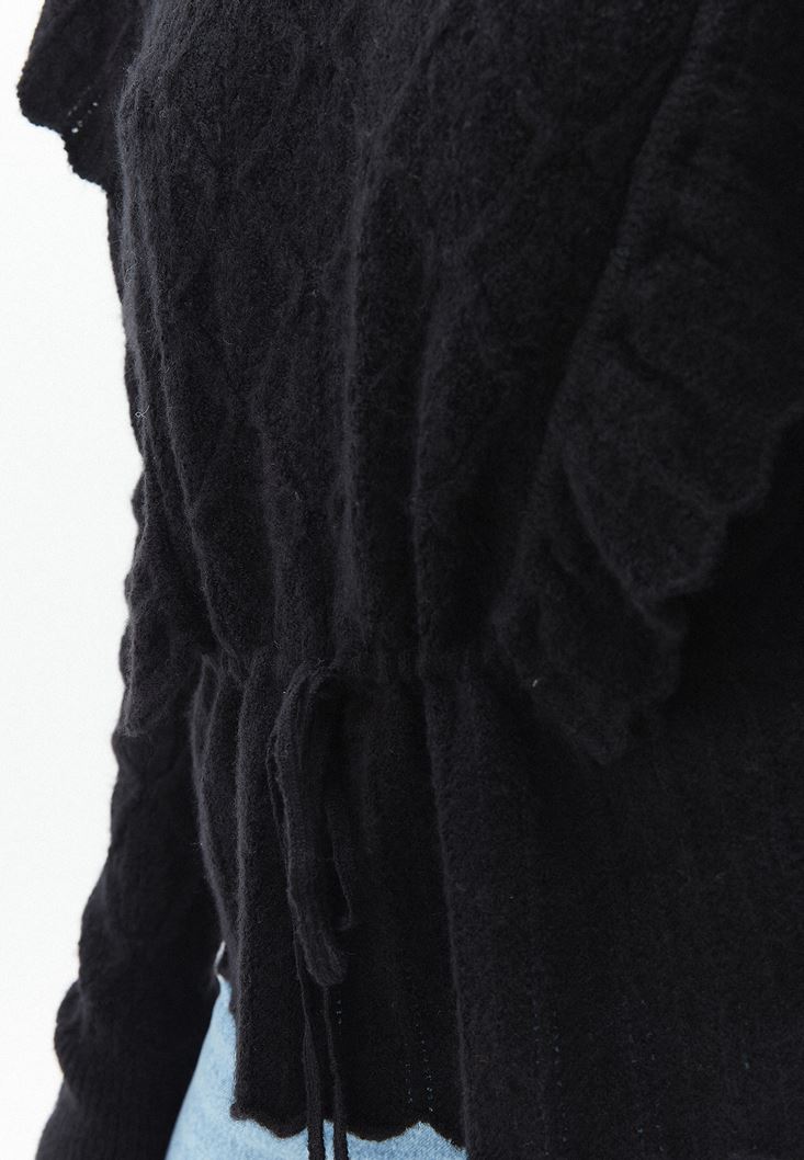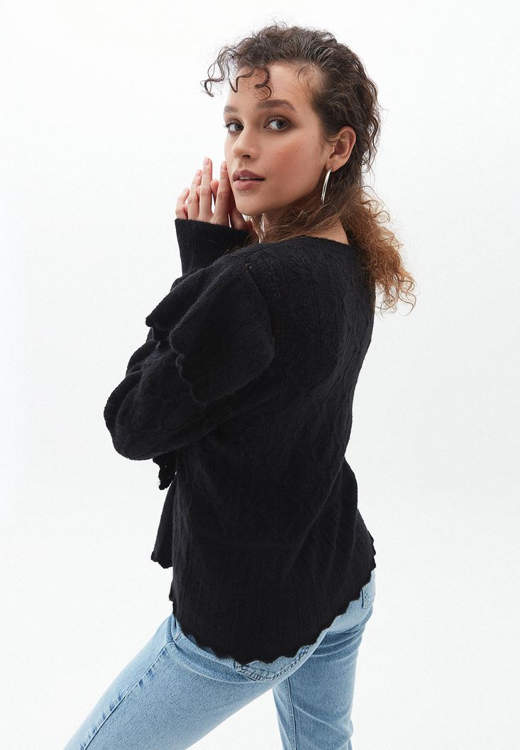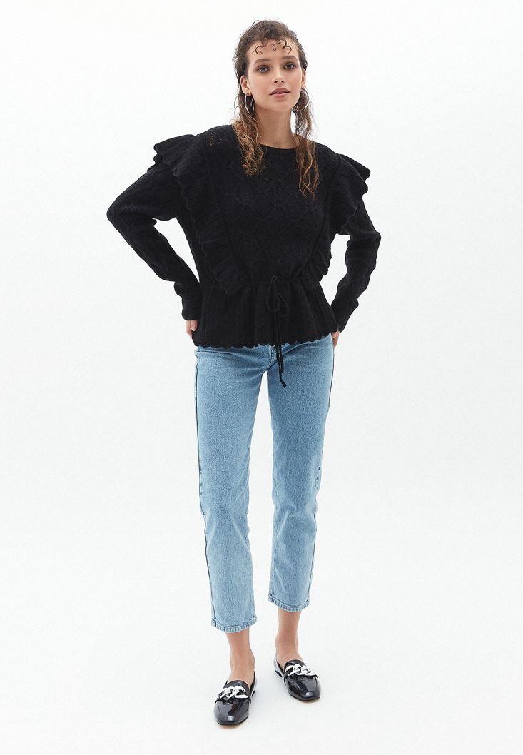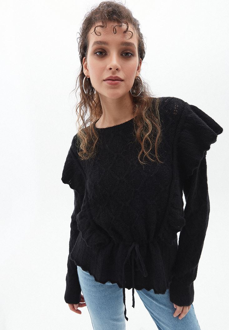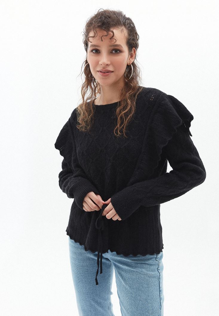 Siyah Fırfır Detaylı Ajurlu Triko Kazak