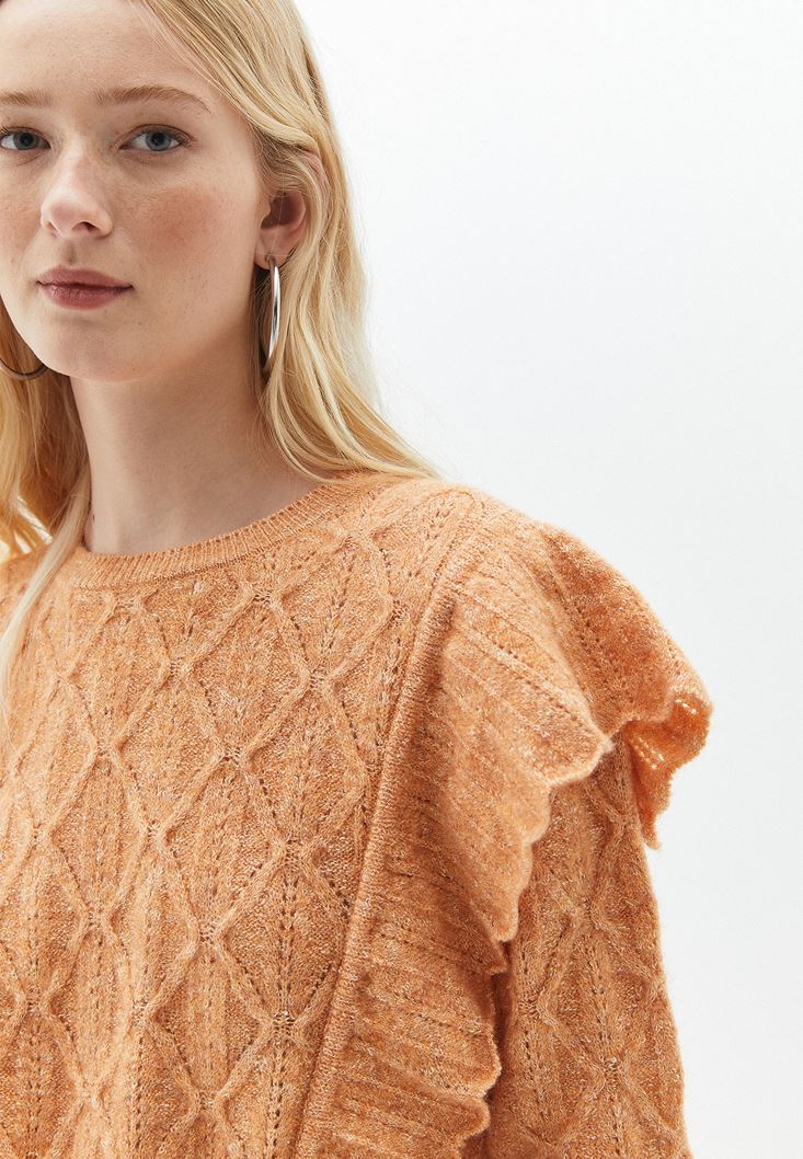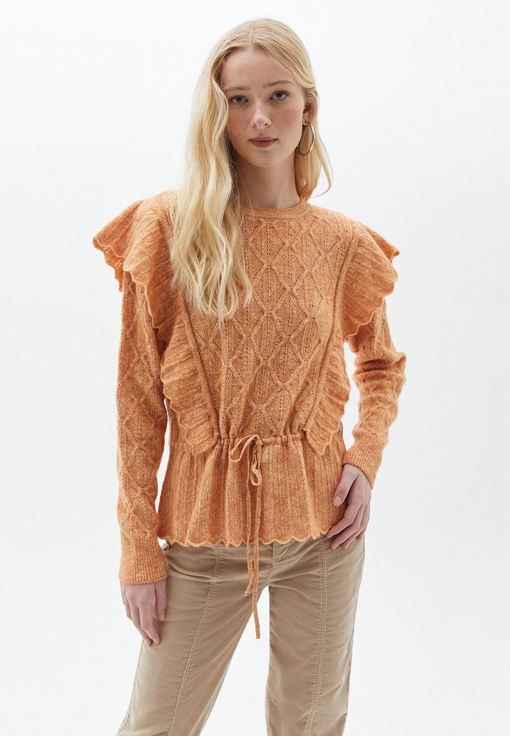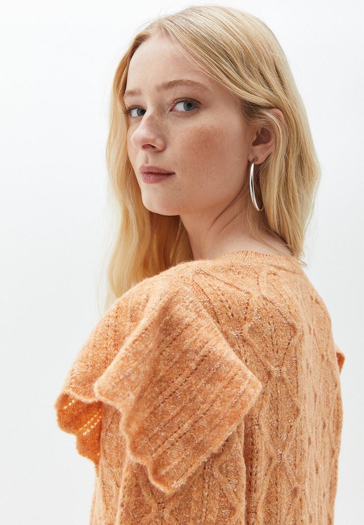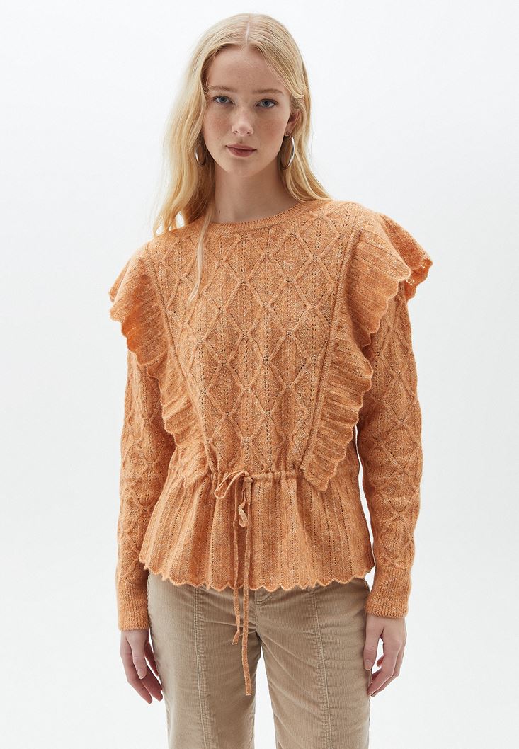 Turuncu Fırfır Detaylı Ajurlu Triko Kazak