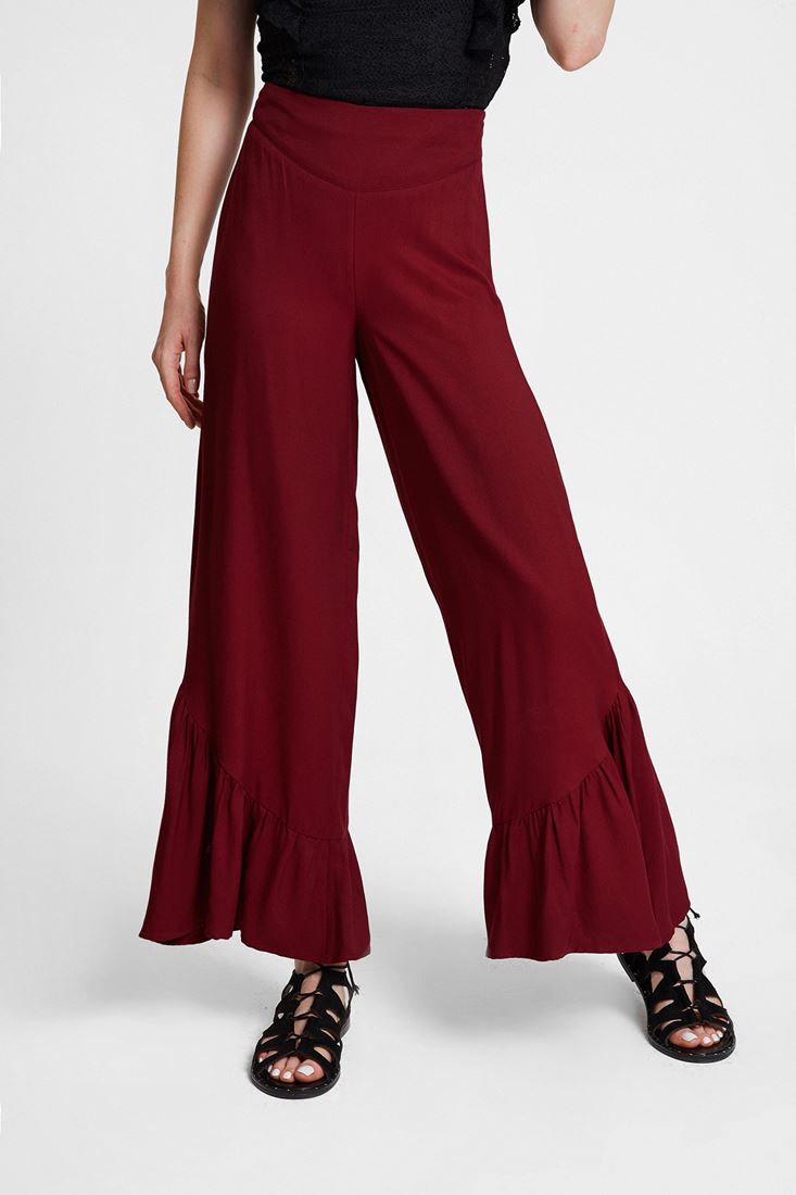 • Bayan Bordo Fırfır Detaylı Bol Pantolon