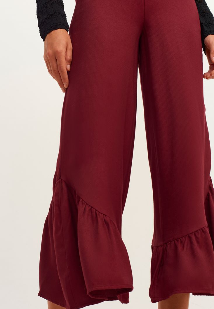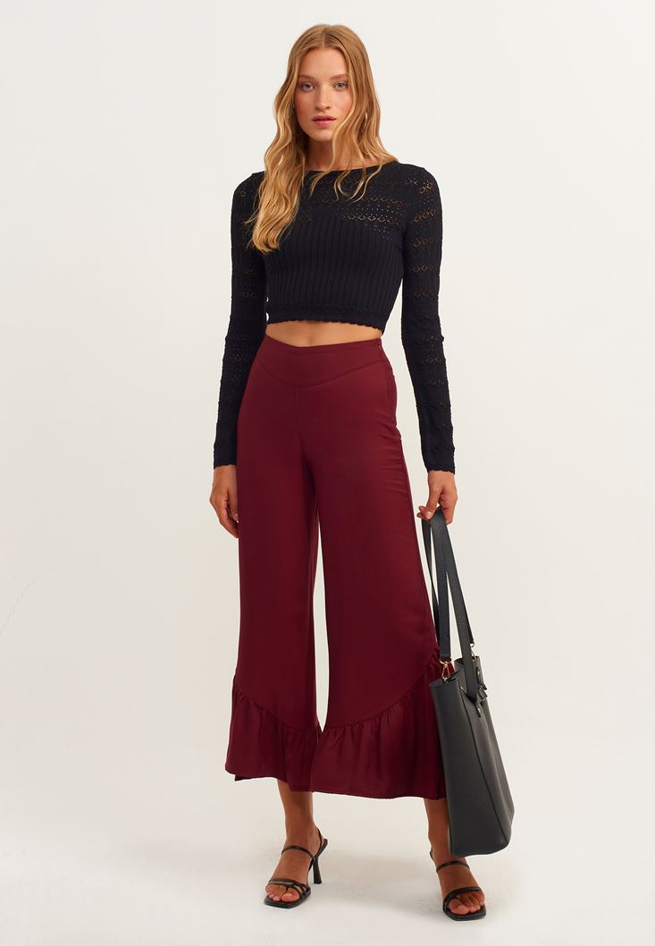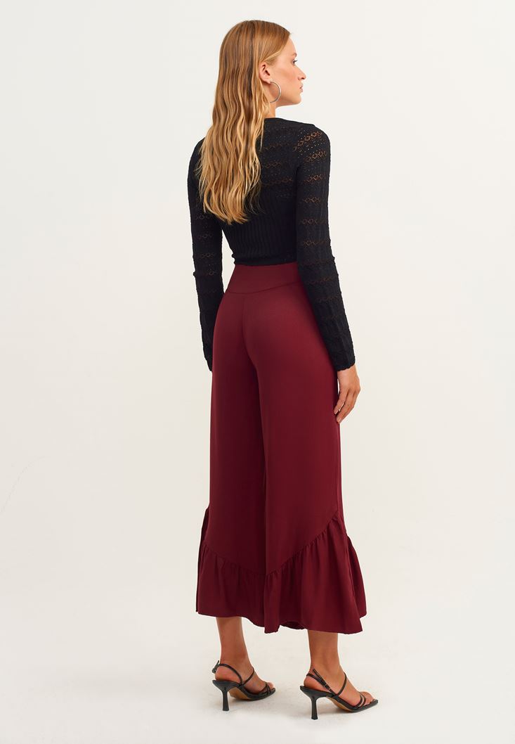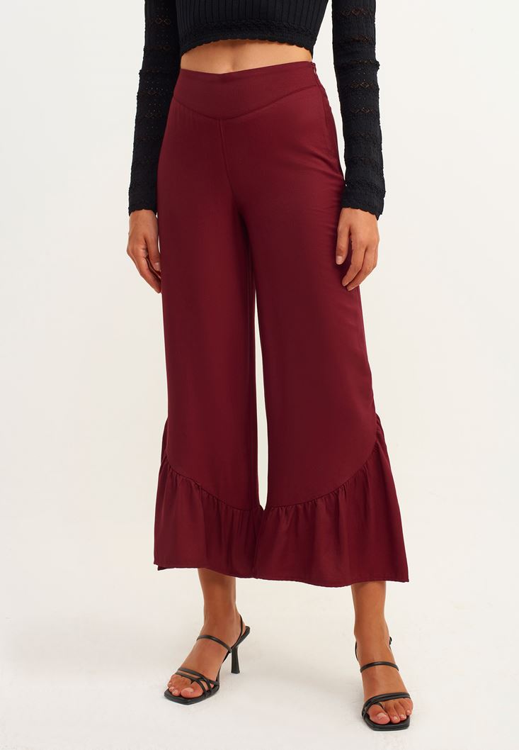 • Bayan Bordo Fırfır Detaylı Bol Pantolon
