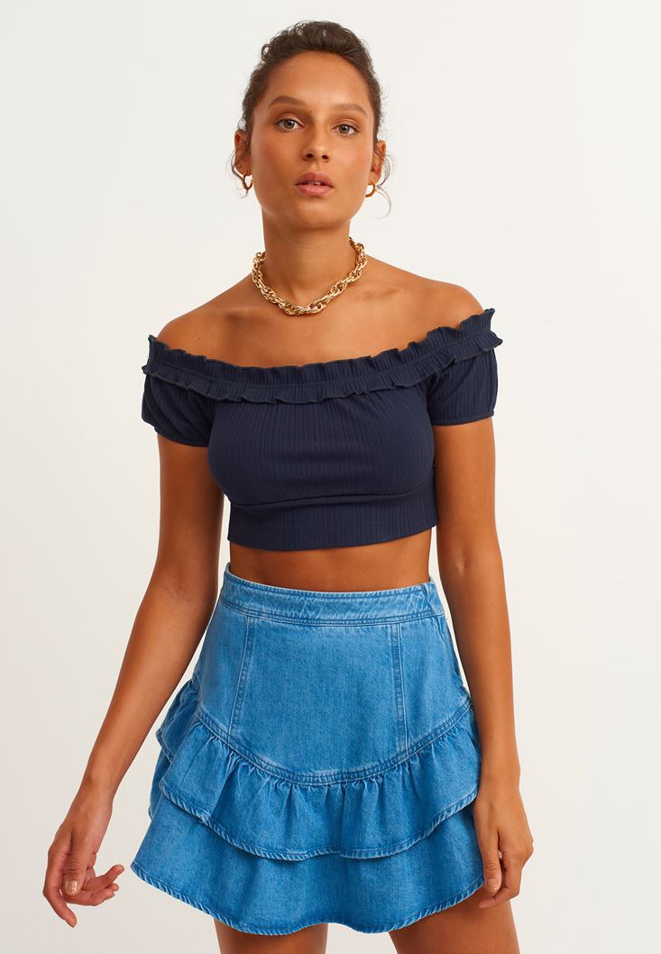 • Bayan Lacivert Fırfır Detaylı Crop Top