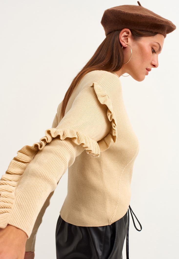 • Bayan Ekru Fırfır Detaylı Crop Triko