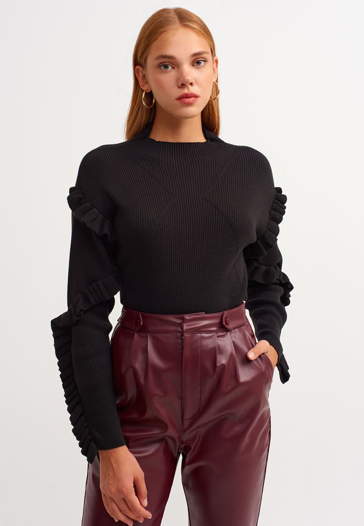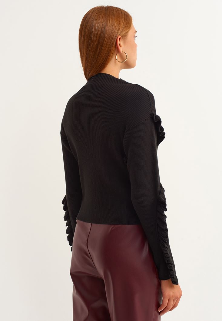 • Bayan Siyah Fırfır Detaylı Crop Triko