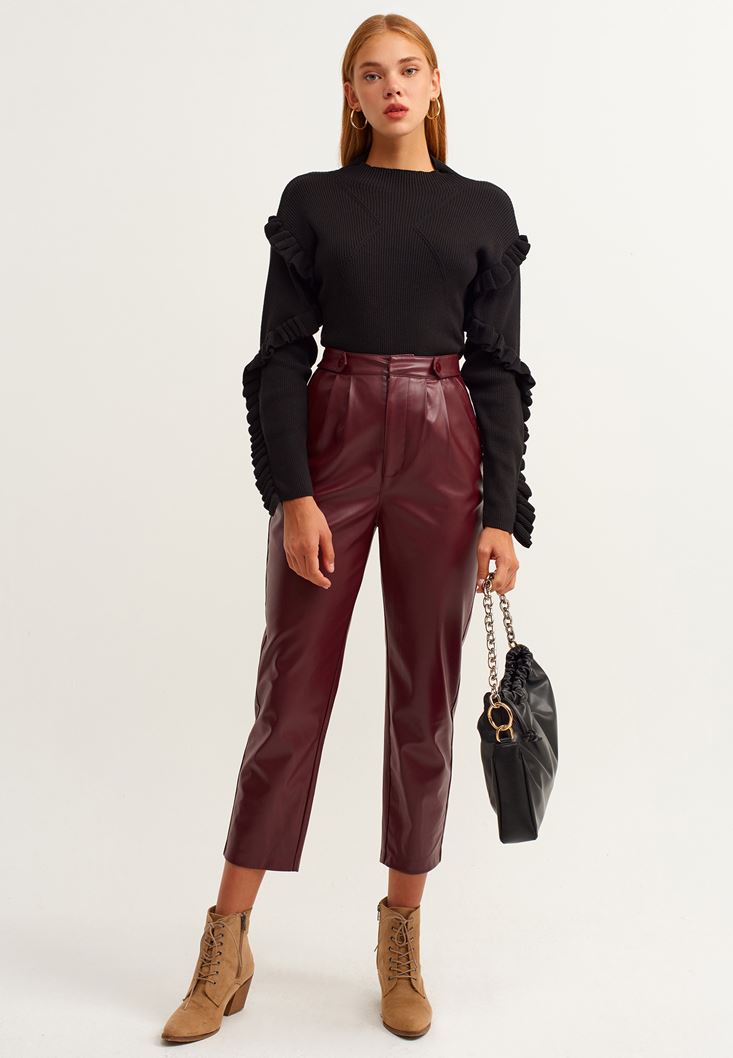Pamuk karışımlı triko doku, yüksek yaka, kol boyunca fırfırlı, bedeni saran close-fit, ön kısmı örgü motifli.