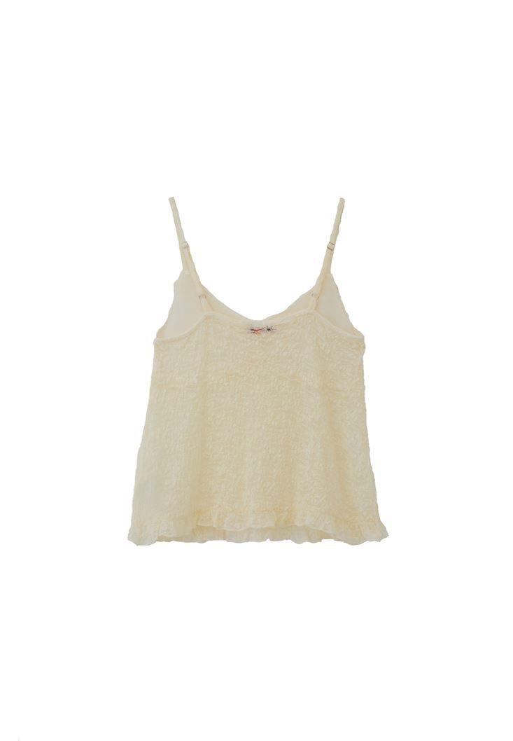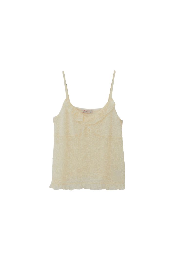 Dantel işlemeli özel doku, V yaka, ince askılı, yakası ve bel kısmı fırfır detaylı, bedene yakın rahat fit, göğüs kısmı astarlı.