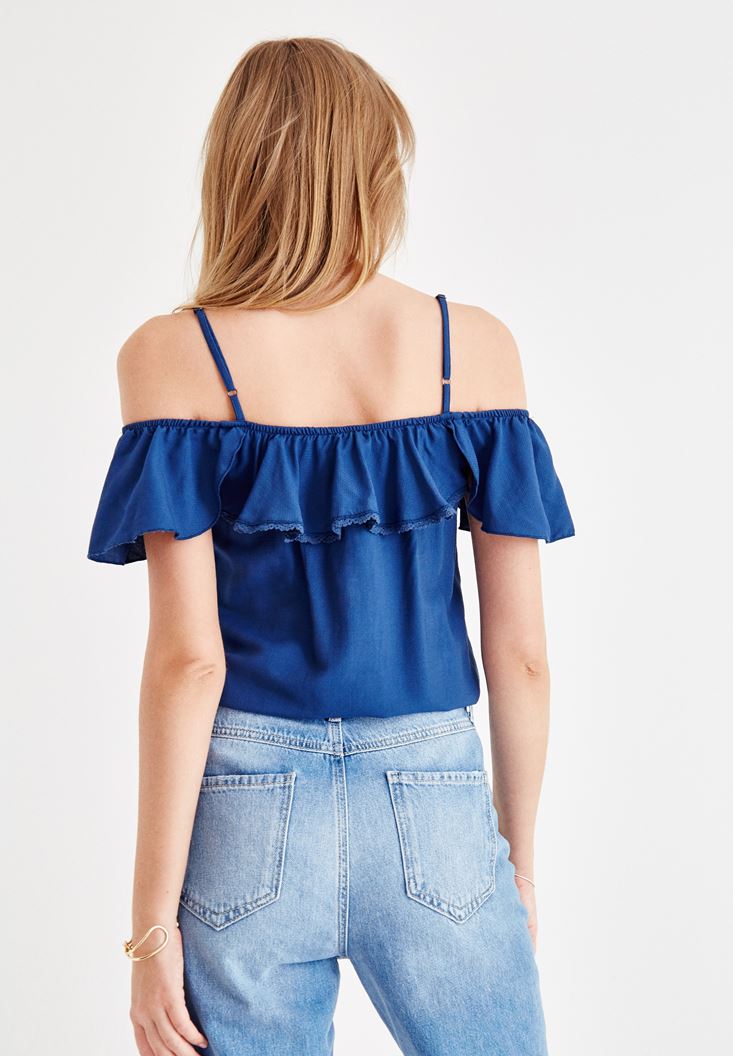 Mavi Fırfır Detaylı Düşük Omuzlu Bluz