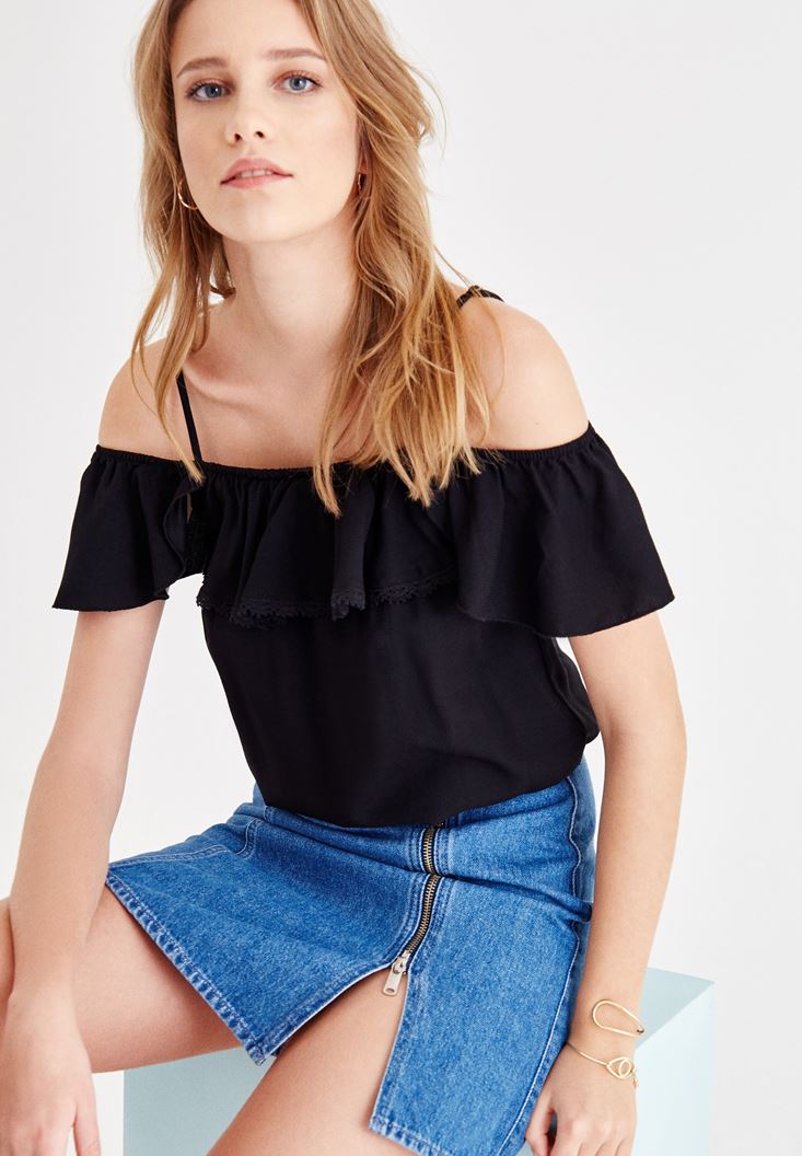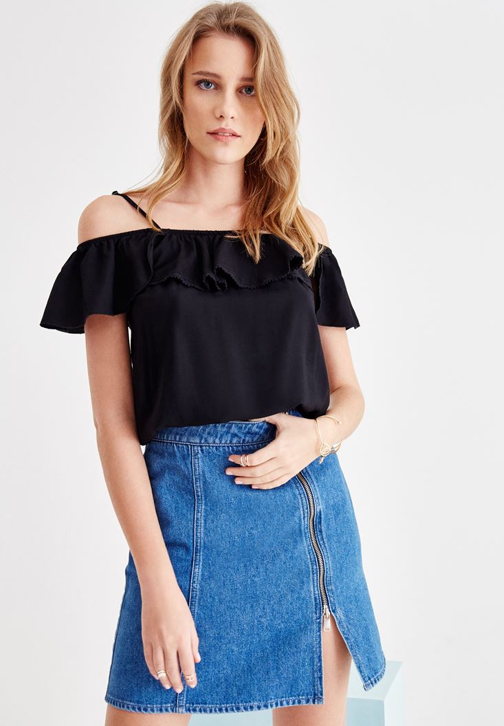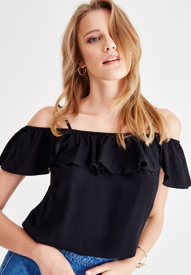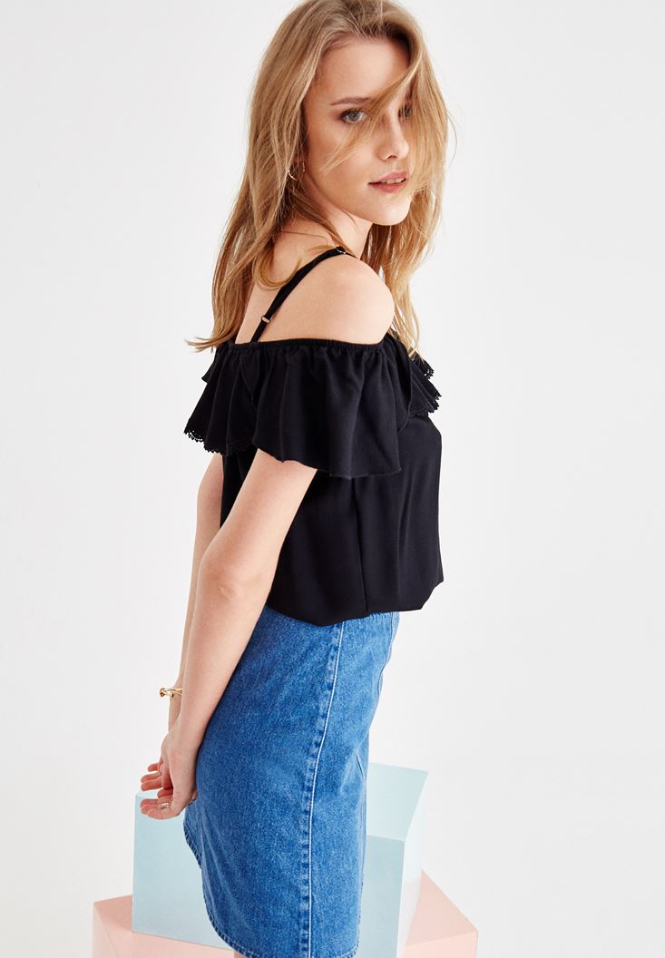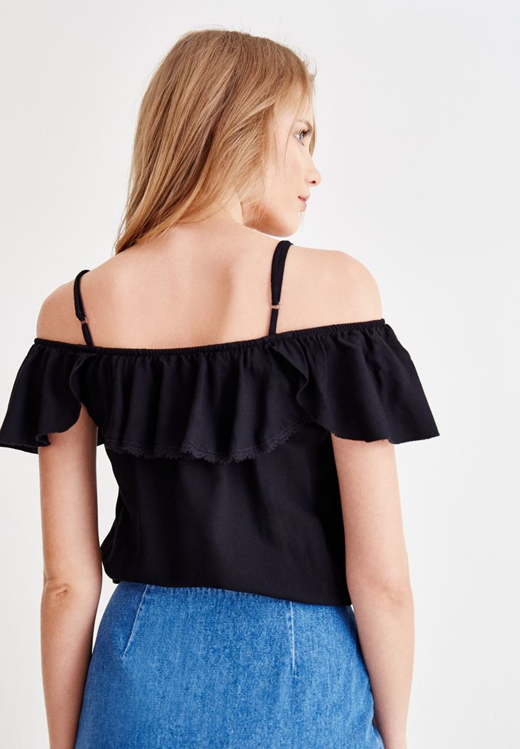 Siyah Fırfır Detaylı Düşük Omuzlu Bluz