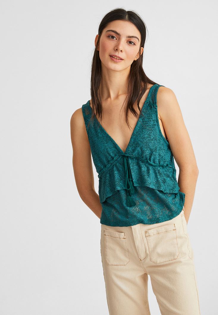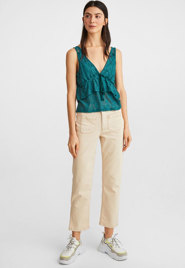 Fırfır Detaylı Jakarlı Bluz modeli zengin kumaş görünümü ,doku detayı, viskon dokusunun nefes alan yapısı ve yüksek seviyede nem çekme özelliğinden dolayı gün boyu hareket özgürlüğü sunan bir modeldir. Fırfır detaylı kadın bluz modelinde göğüs kısmında kullanılmış olan püsküllü bağlama detayı ve dikiş üzerinden geçilmiş olan fırfır detayları ile hareket kazanan zarif ve şık derin v yaka bluz, kombinlerinizde her zaman yer vermekten keyif alacağınız bir modeldir. OXXO fırfır detaylı kadın bluz modeli ile enerjinizi ve zarifliğinizi yansıtın.