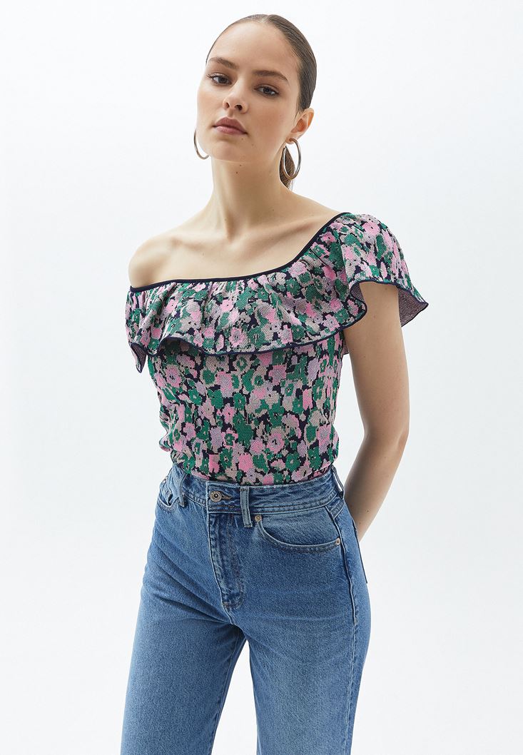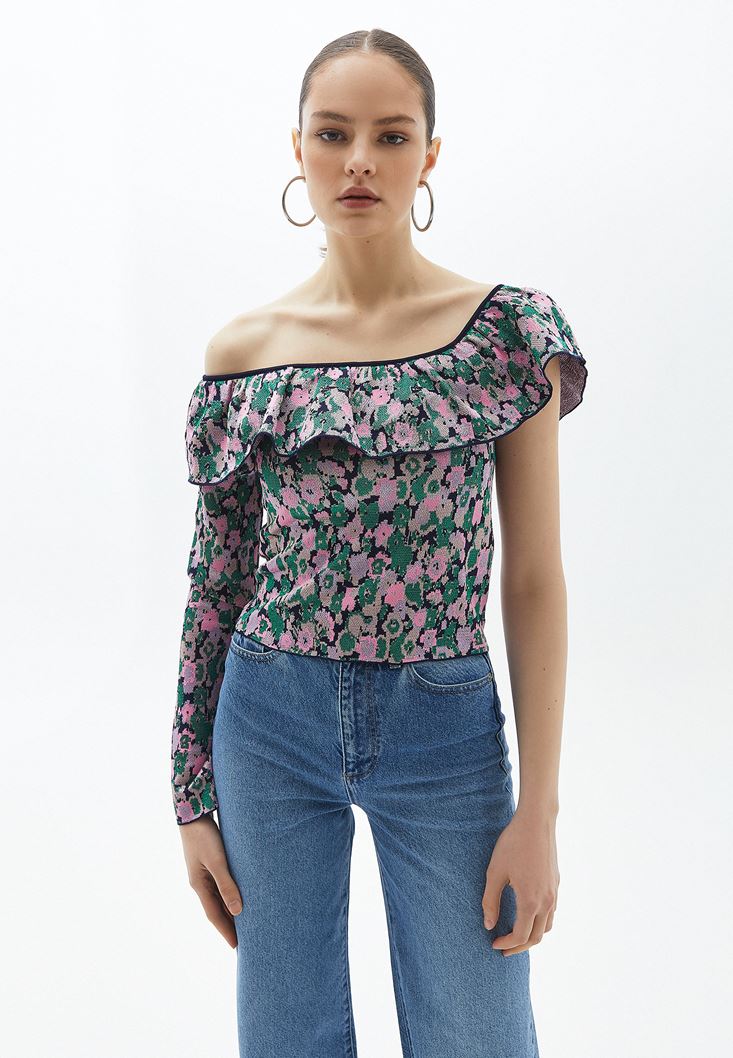 Çiçek desenli özel doku, tek omuz detaylı, kısa ve uzun kollu asimetrik tasarım, standart boy, bedeni saran fit, omuz-yaka ve sırt boyunca fırfır detaylı.