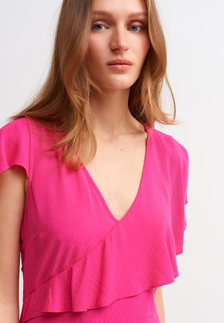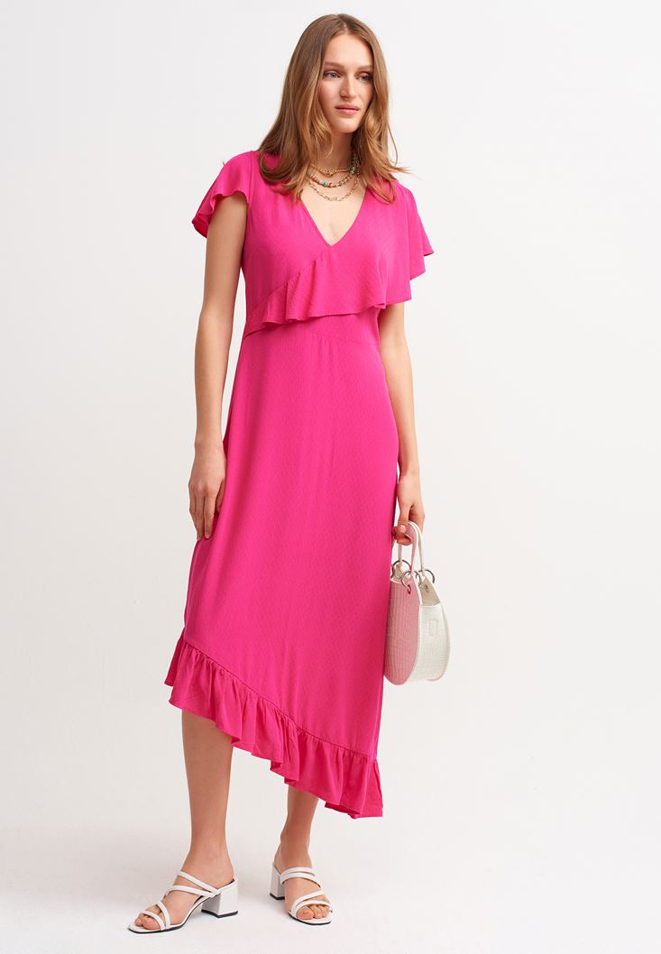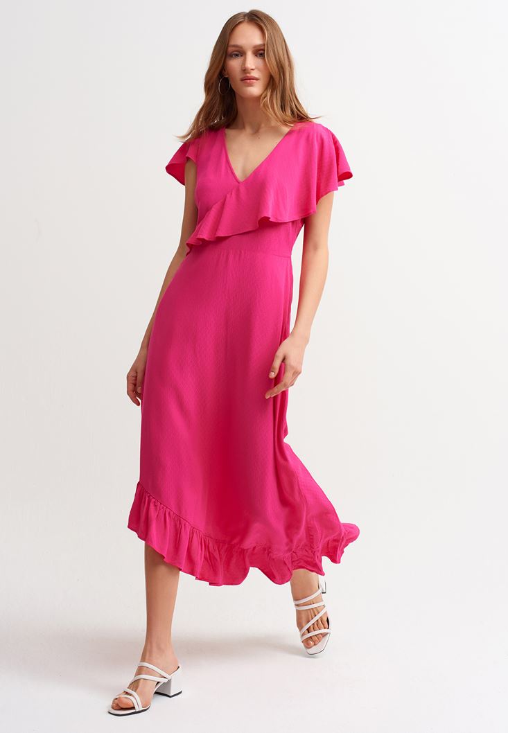 • Bayan Pembe Fırfır Detaylı Midi Boy Elbise