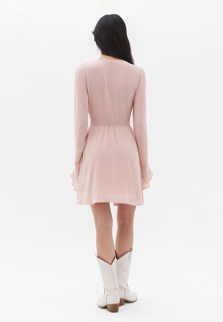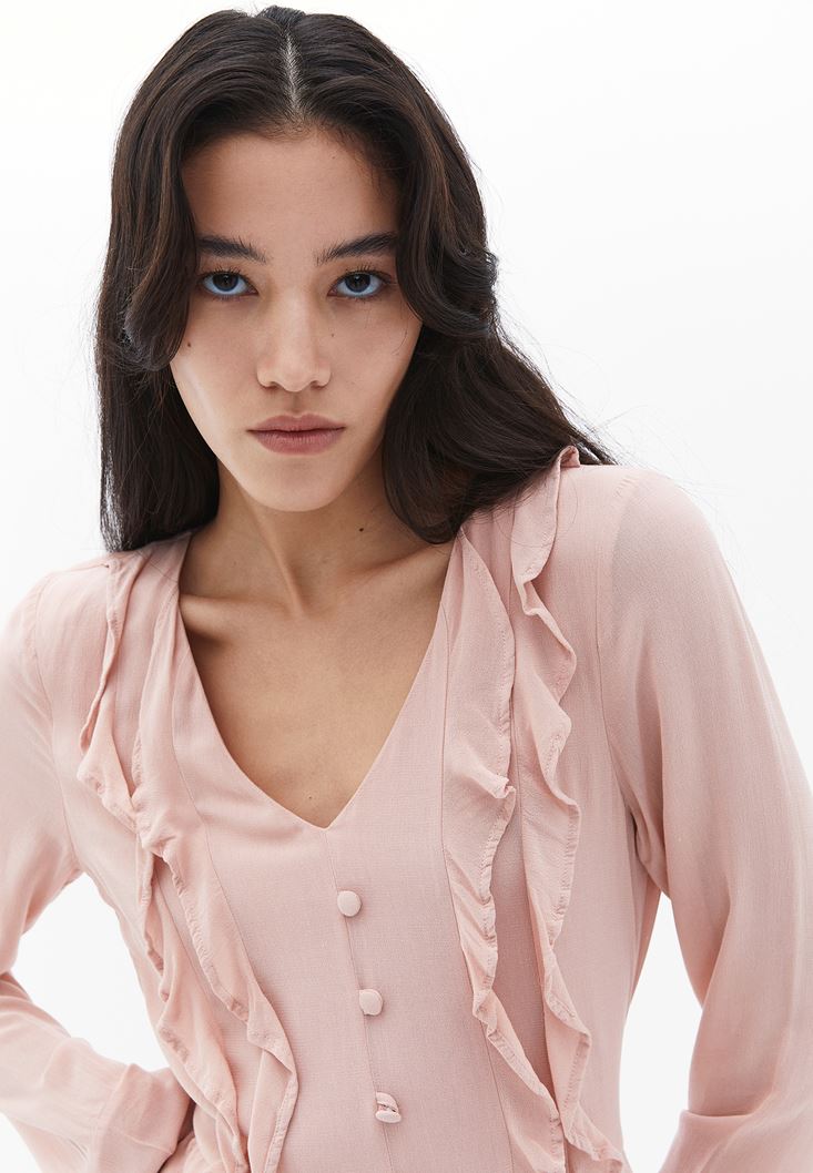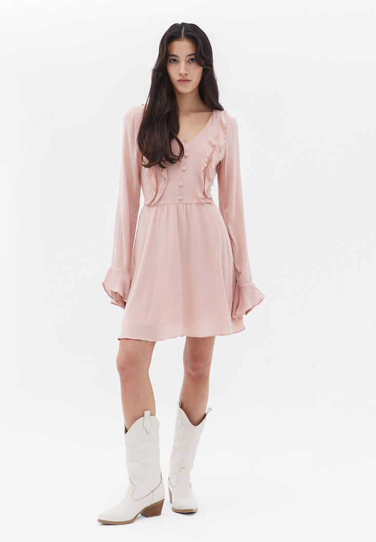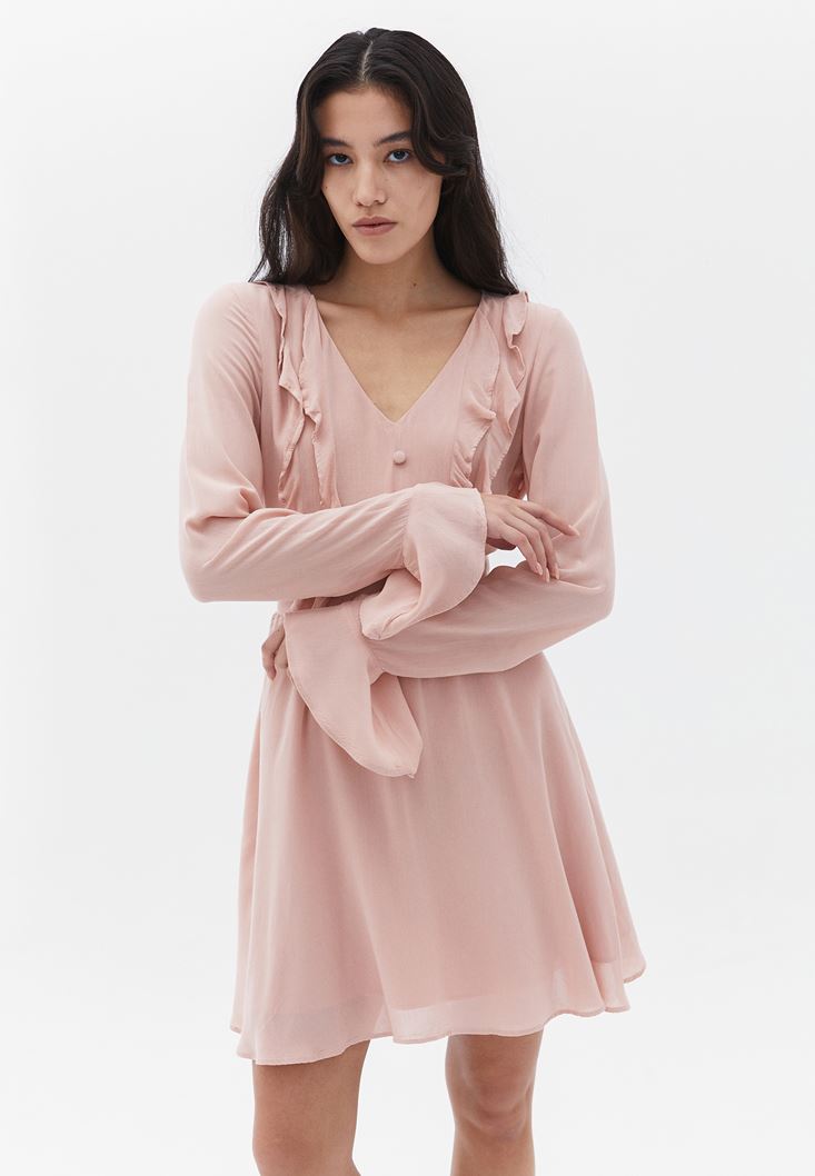 %100 viskon içerikli doku, bedenden uzak A kesim etek, V yaka, ön beden kısmı düğme ve fırfır detaylı, uzun kollu, mini boy, kol ucu fırfırlı, içi astarlı.