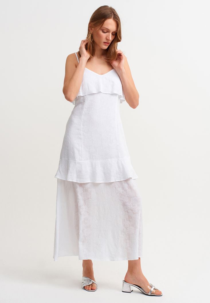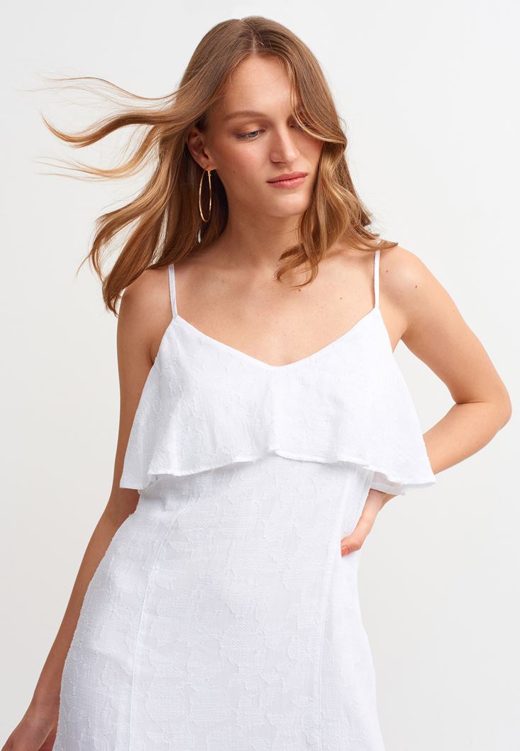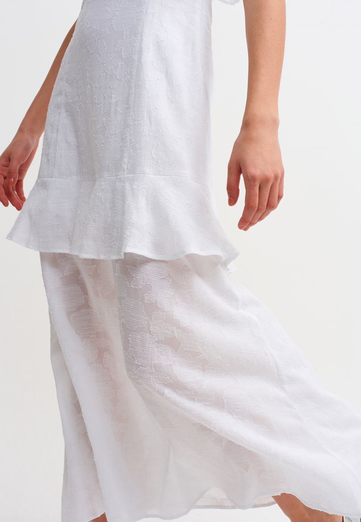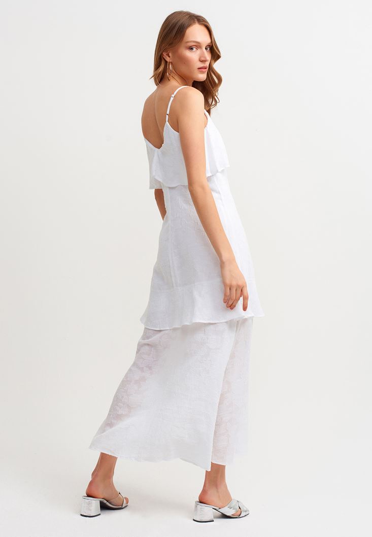 • Bayan Beyaz Fırfır Detaylı Uzun Elbise