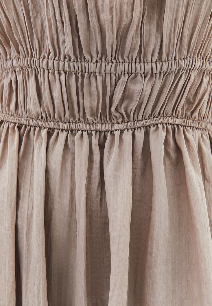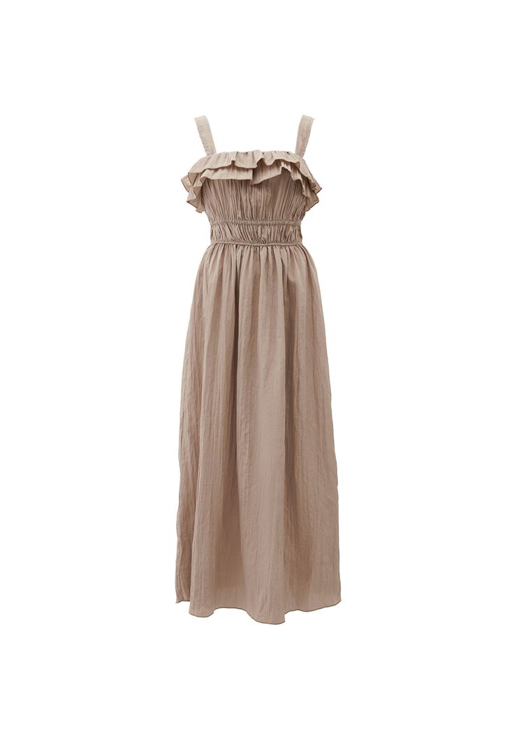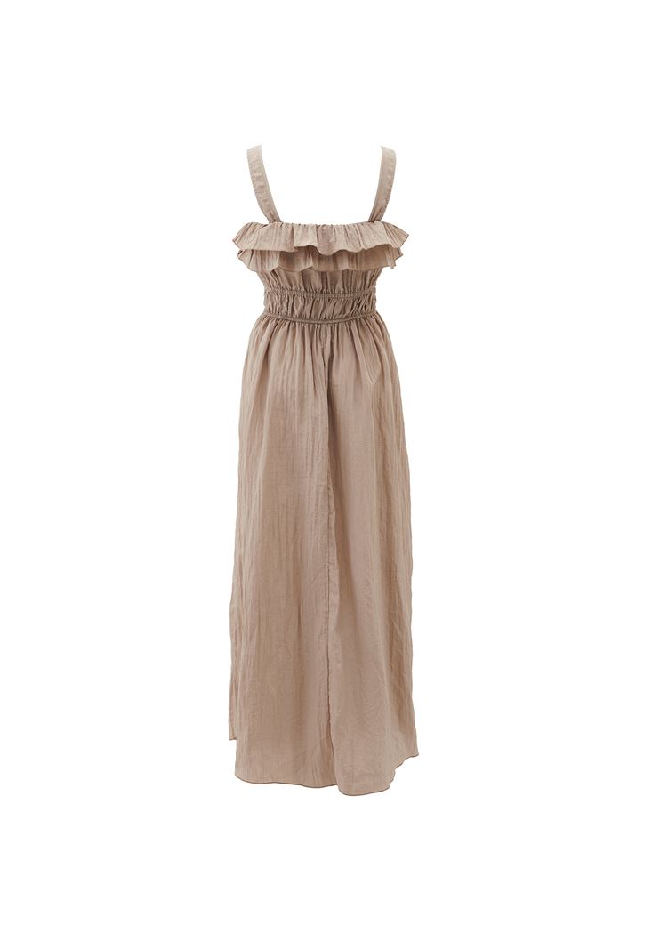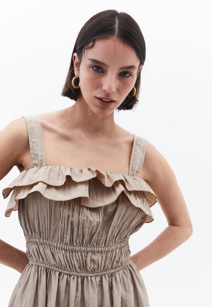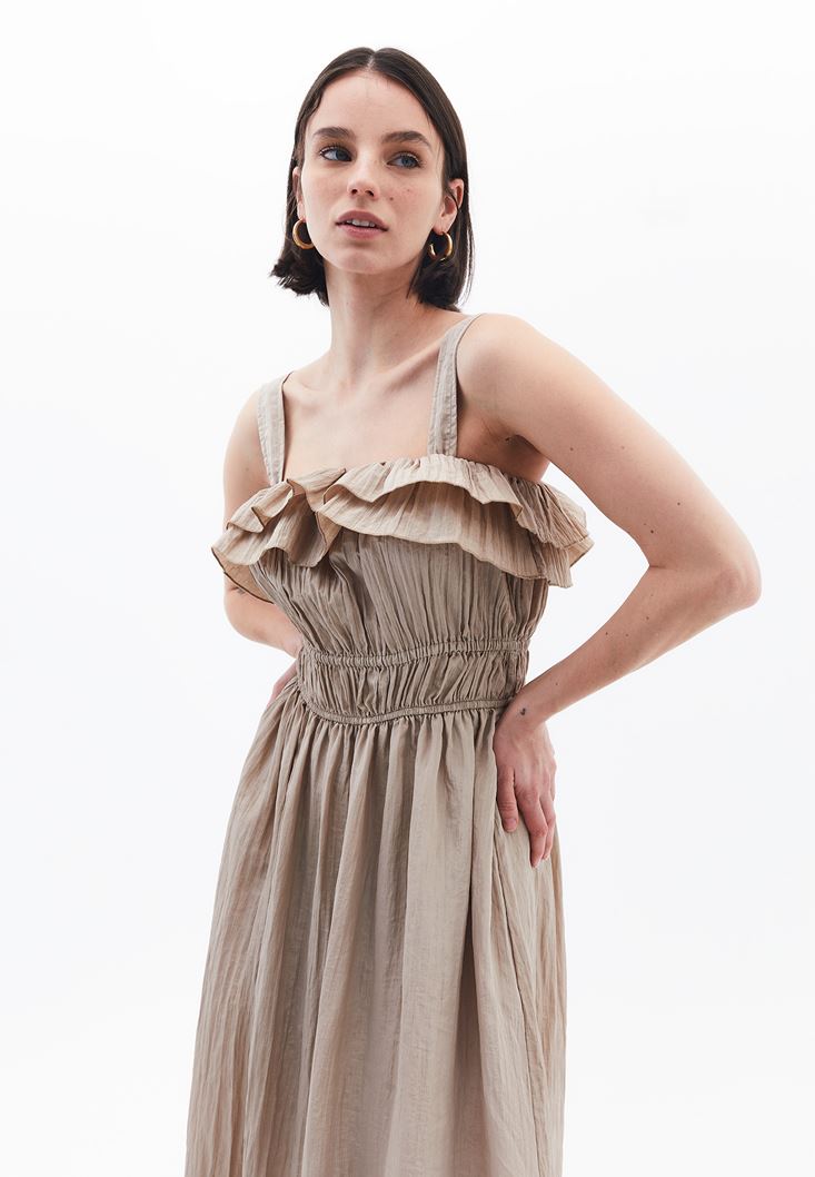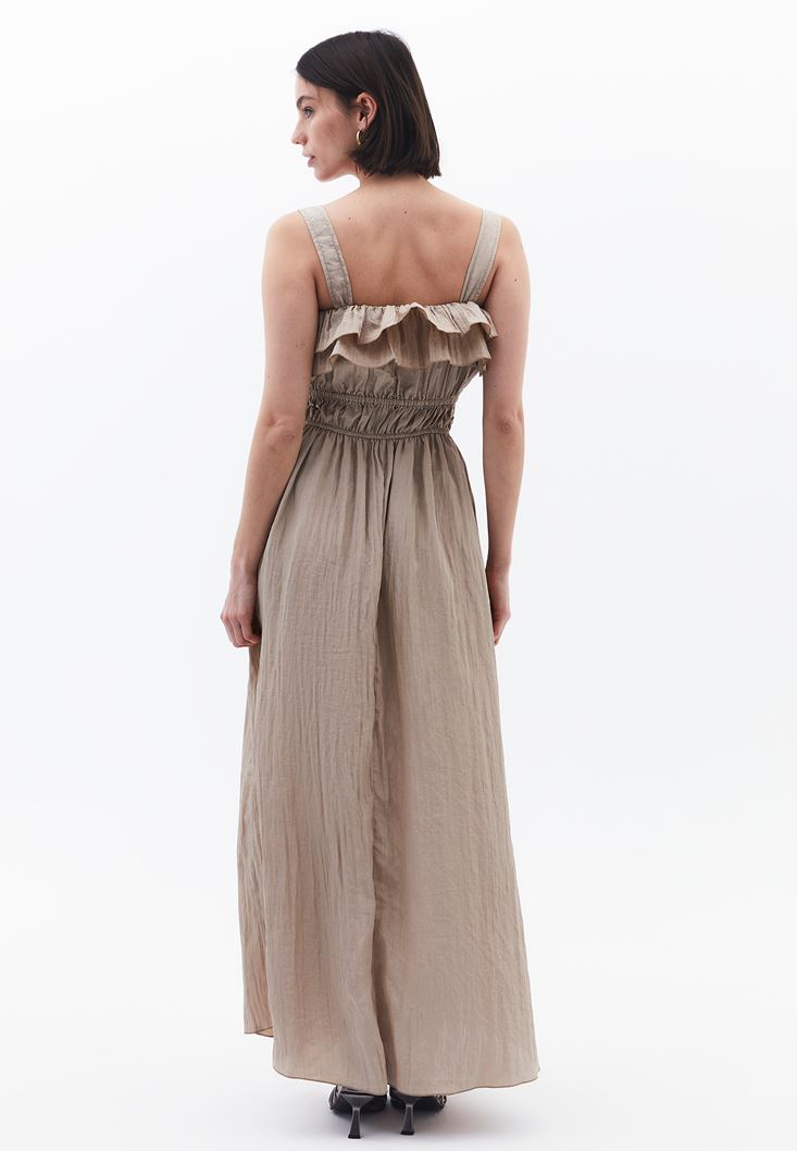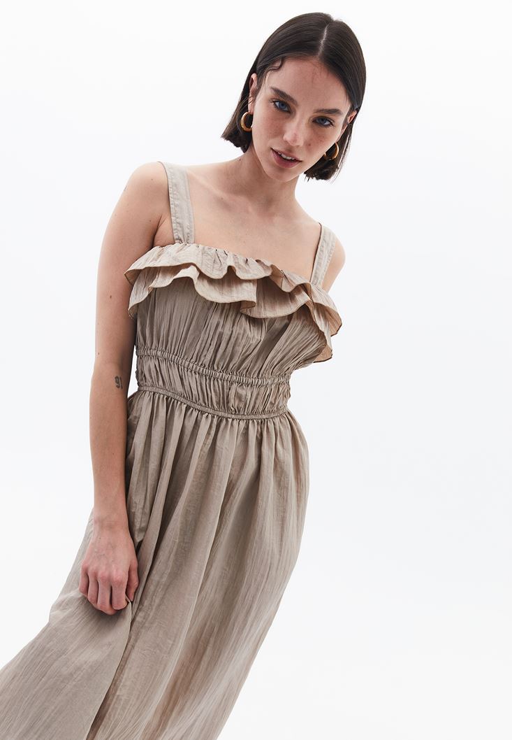 • Bayan Bej Fırfır Detaylı Uzun Elbise
