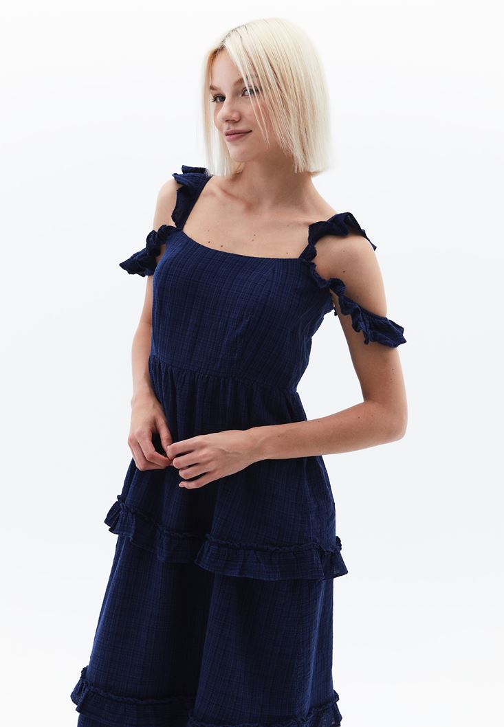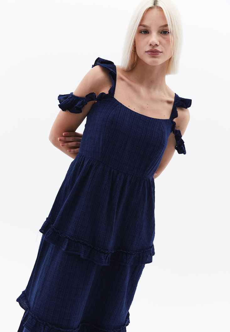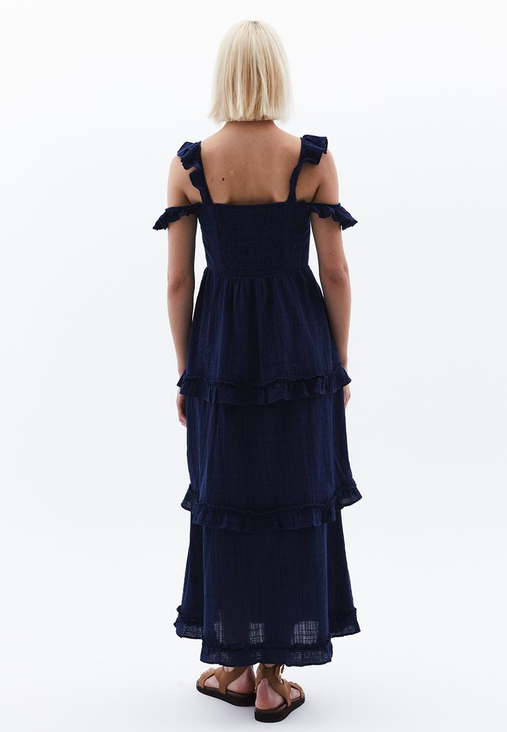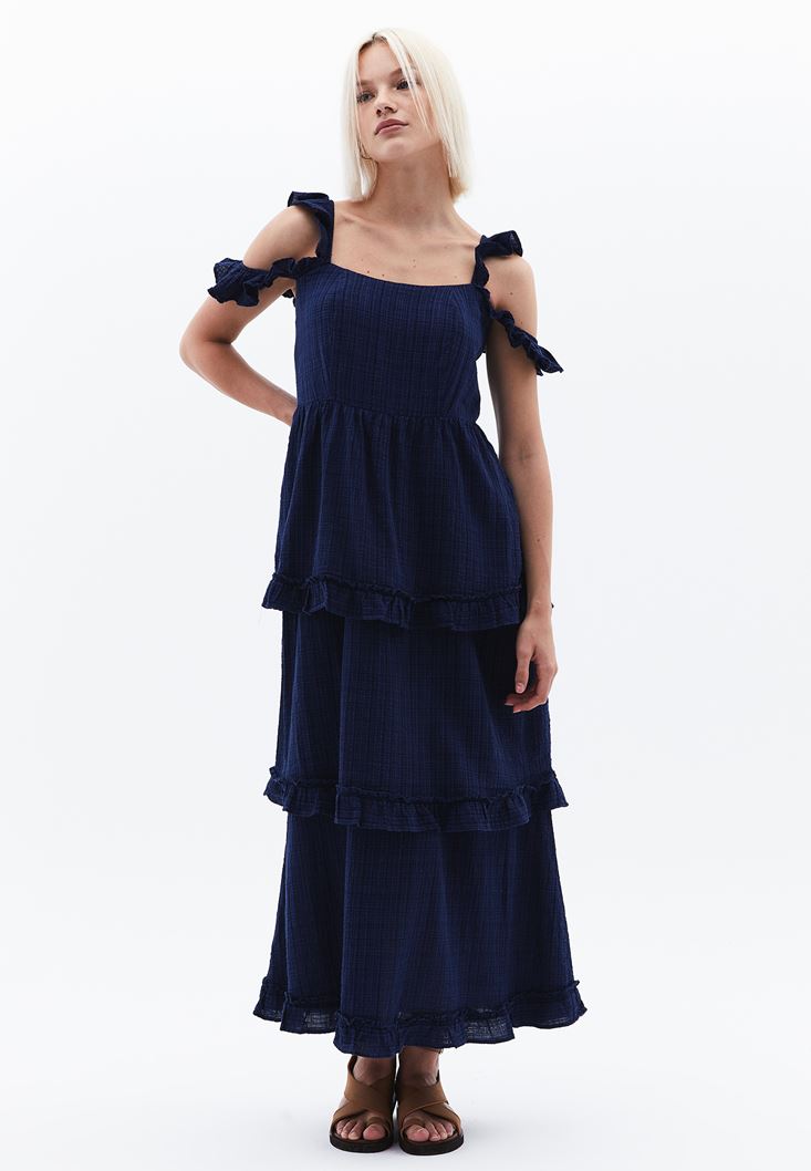 Mavi Fırfır Detaylı Uzun Elbise