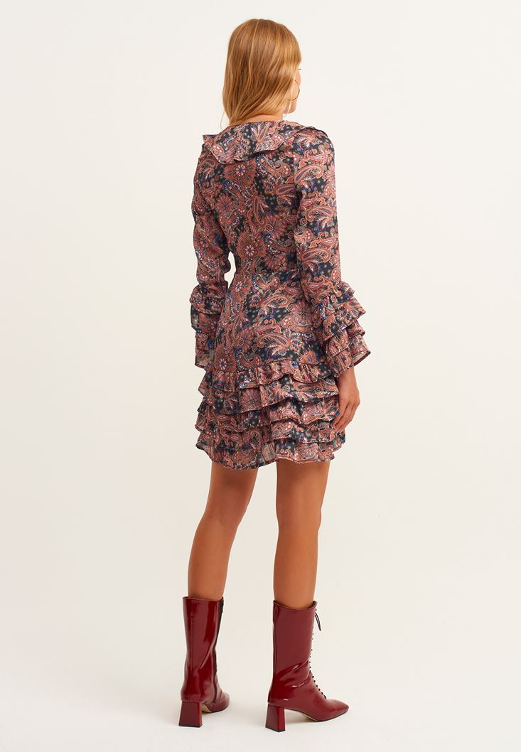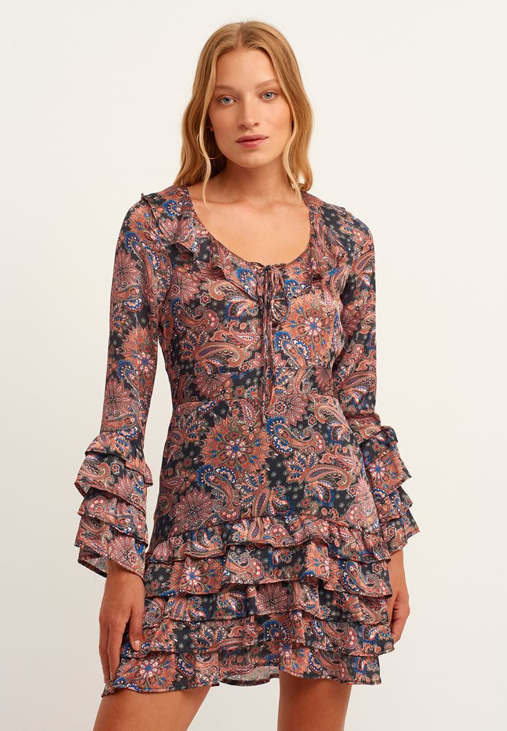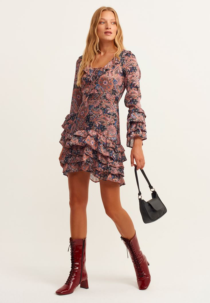 Çok Renkli Fırfır Detaylı Uzun Kollu Desenli Elbise