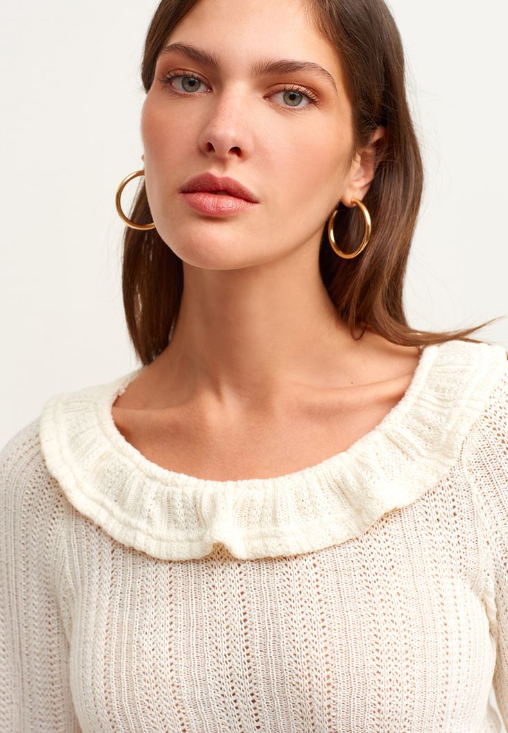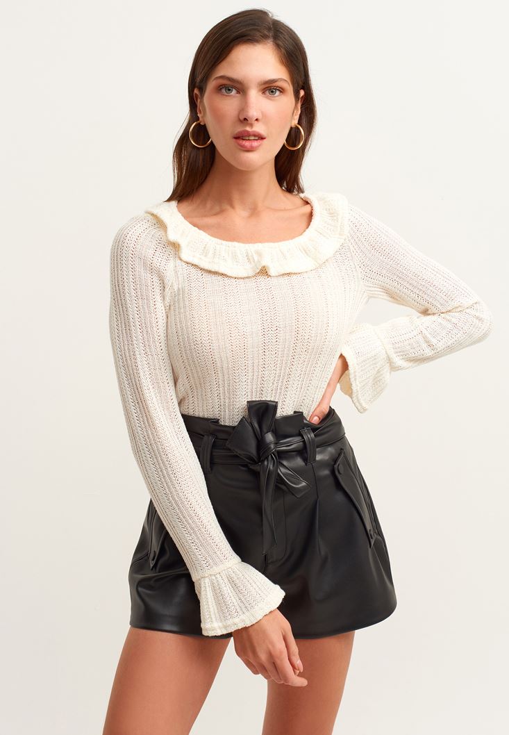 Hareketli fırfırlar iyi ki bizimle! Nostalji rüzgarları estiren ve fitilli örme dokusu ile göz kamaştıran bu parça ile kombinlerin yükselişe geçecek... Onunla birlikte kullanabileceğin floral desenli uzun etekler ve vegan süet çizmelerle mevsime uygun bir görünüm yaratabilirsin. Fırfırlı bluz ile oluşturacağın bu sıcak nostaljiyi uzun trençkotlarla tamamlamak isteyebilirsin... West Side koleksiyonu ile gelen fırfırlı bluz modeli, dolabının en hareketli parçalarından biri olacak! :)