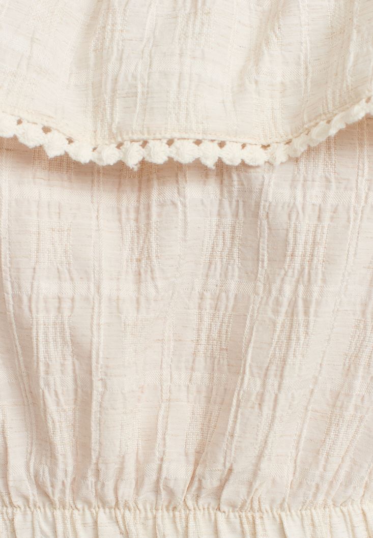 Keten ve viskon karışımlı doku, fırfırlı yaka ve kol detayı, beli ve omzu lastikli, crop kesim, fırfır uçları motifli.