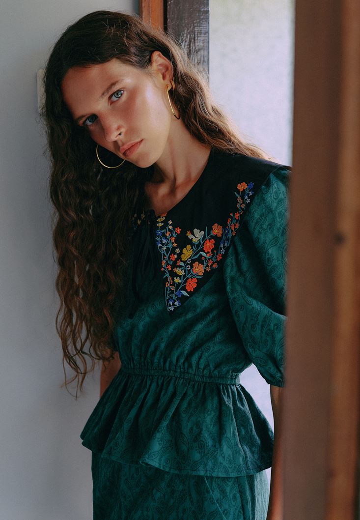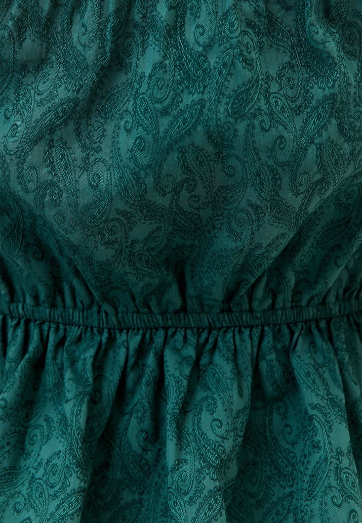 Pamuk karışımlı ve jakarlı doku, kare yaka form, balon kollu, kol ucu/omuz kısmı ve beli lastikli, standart boy.