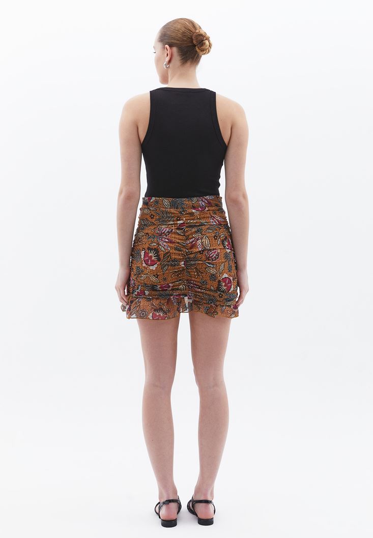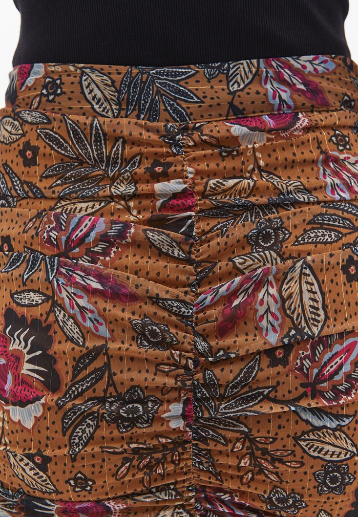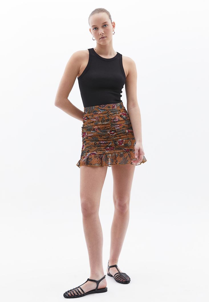 Çiçek desenli tül doku, yüksek bel, mini boy, büzgülü tasarım, etek ucu fırfırlı, yan kısmı gizli fermuarlı, bedene yakın fit.