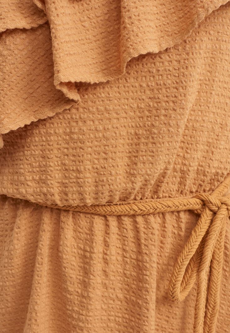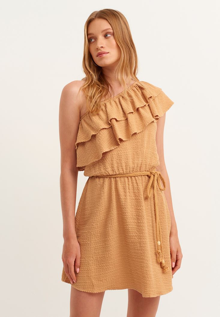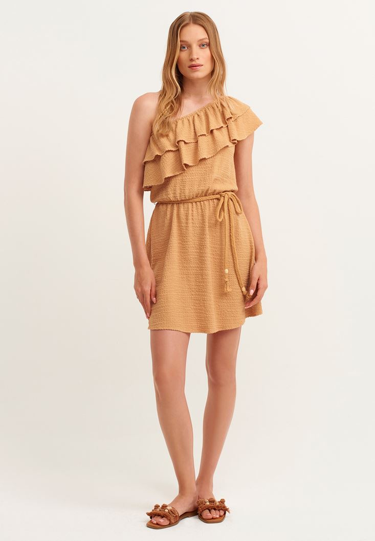Kahverengi Fırfırlı Tek Omuz Elbise