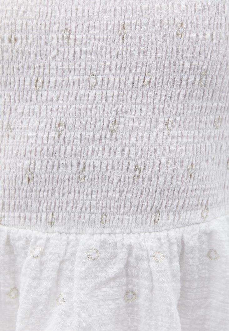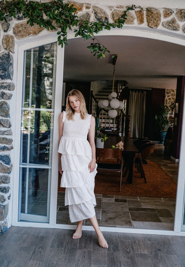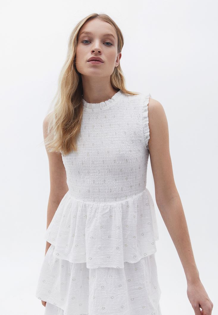 Pamuk ve viskon karışımlı özel doku, sıfır yaka, yaka ve kol ucu fırfırlı, katlı etek tasarım, üst beden kısmı esnek gipeli ve desenli, uzun boy kesim.