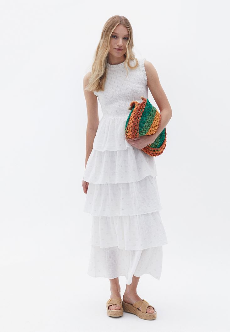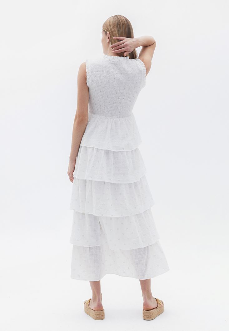 Krem Fırfırlı Uzun Elbise