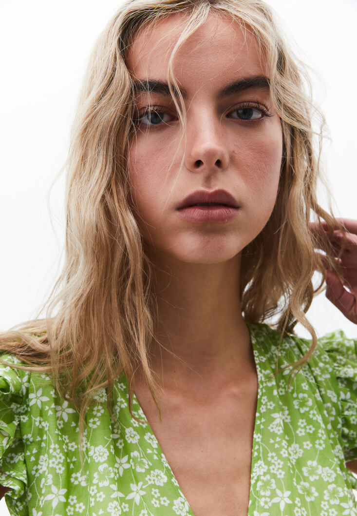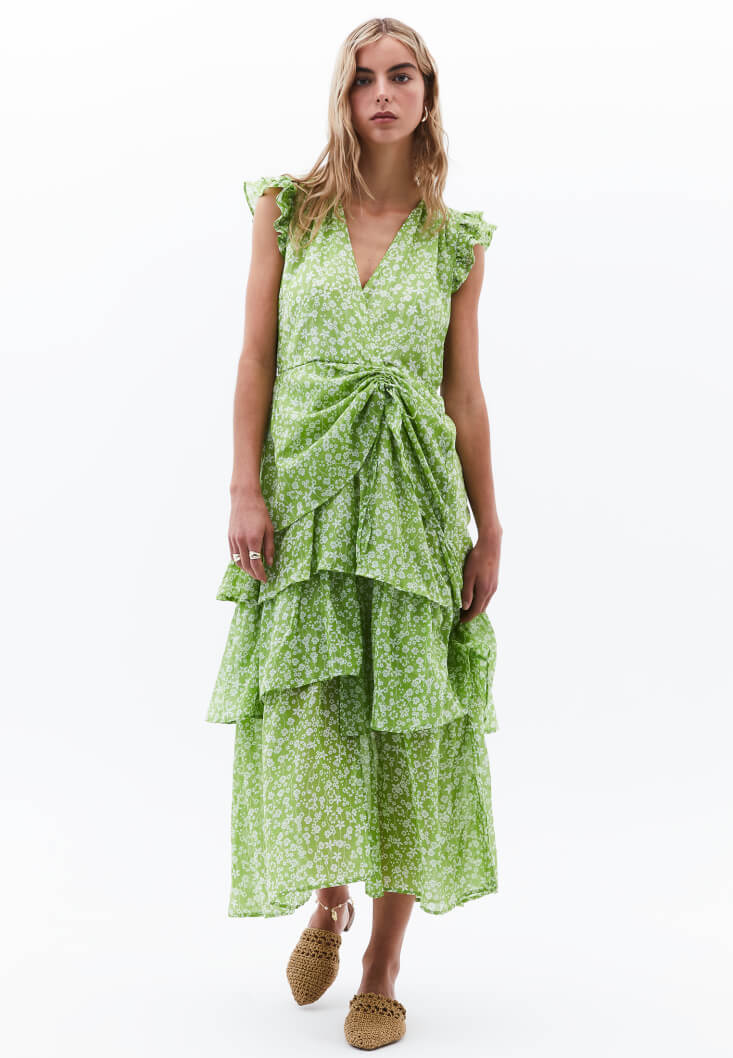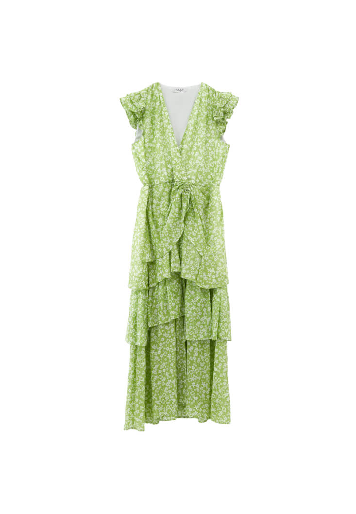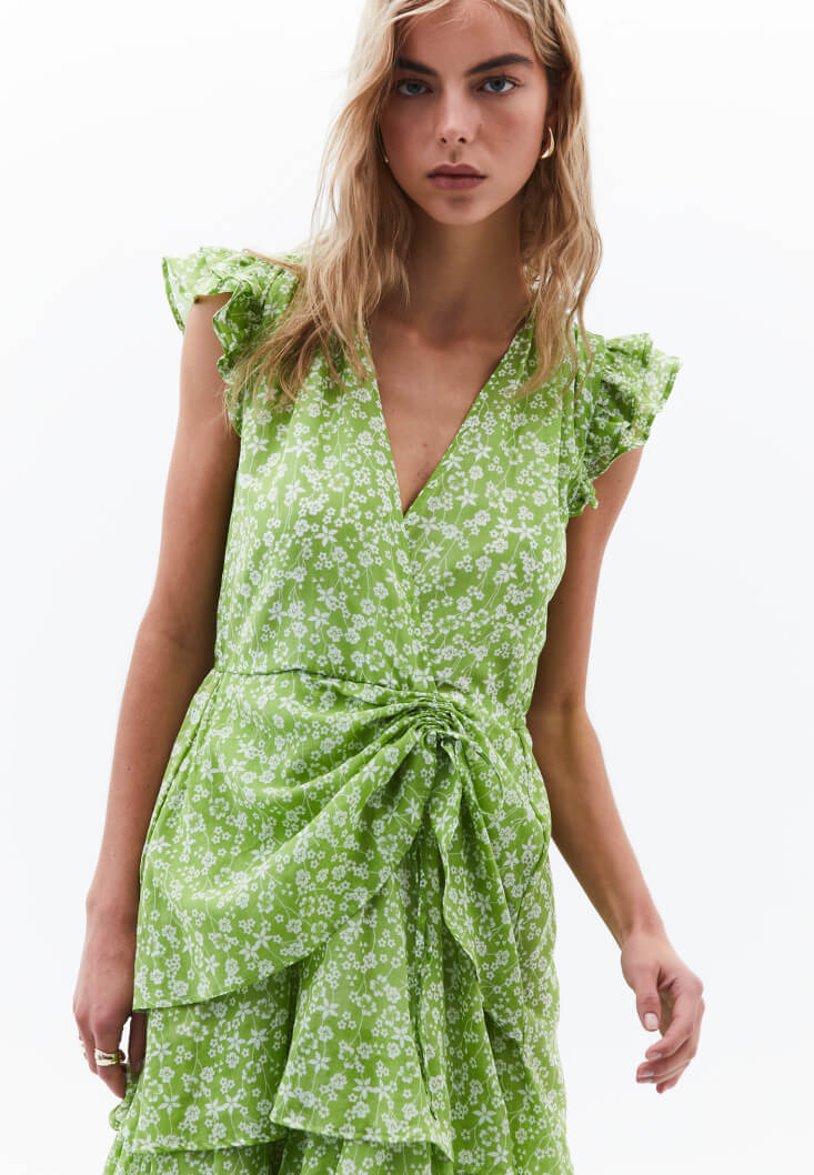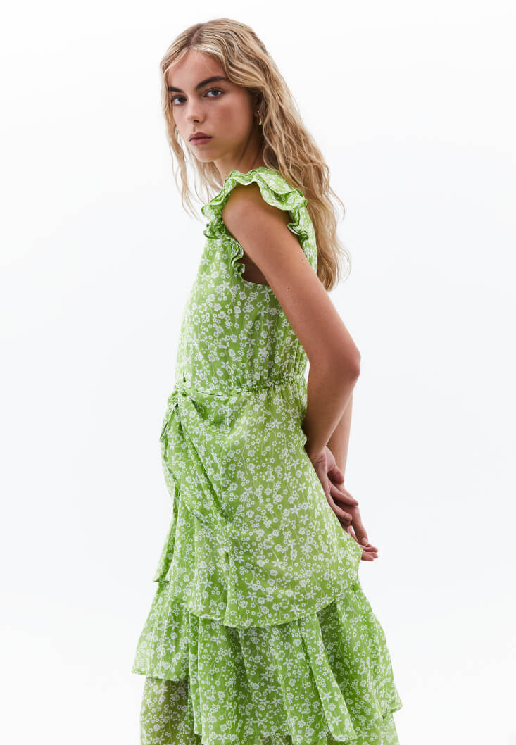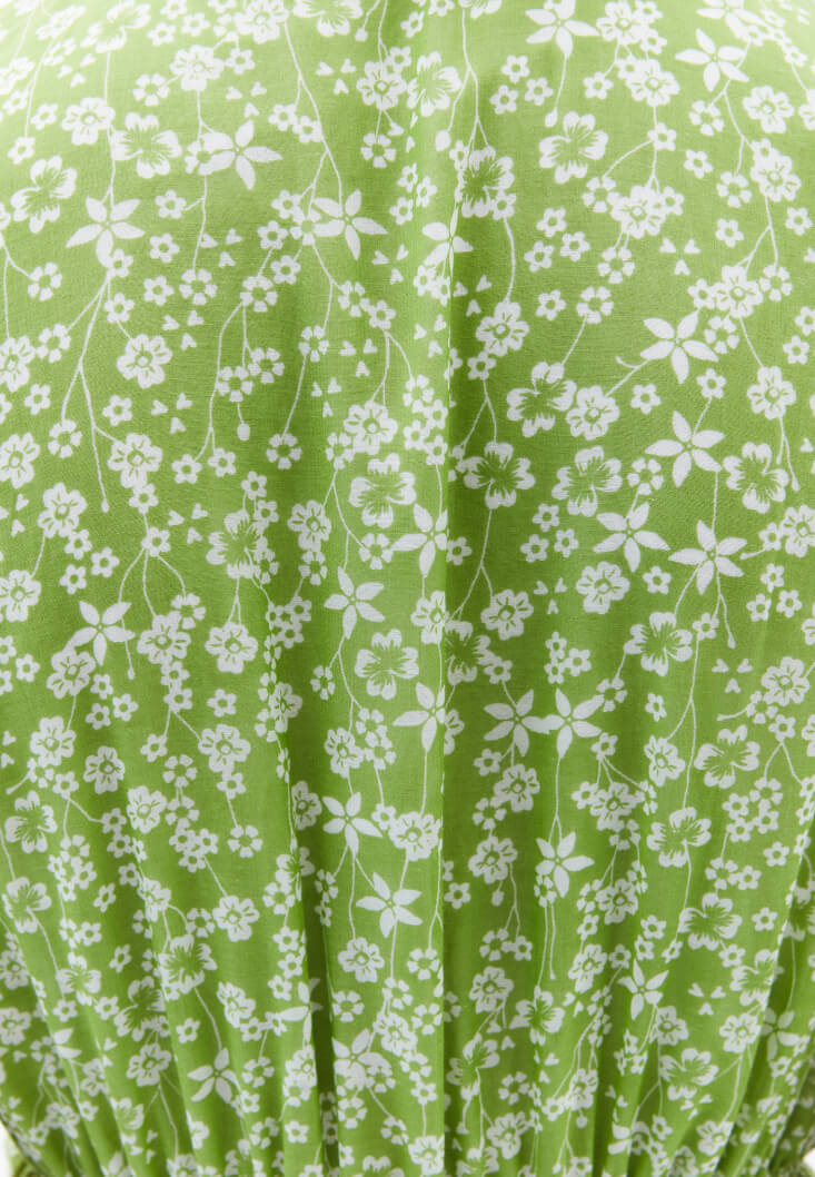Viskon ve pamuk karışımlı özel doku, floral desenli, katlı fırfırlı etek, ön kısmı büzgülü ve bağcık detaylı, kruvaze yaka, kol kısmı fırfır detaylı, uzun asimetrik kesim, arka bel kısmı lastikli, içi astarlı.