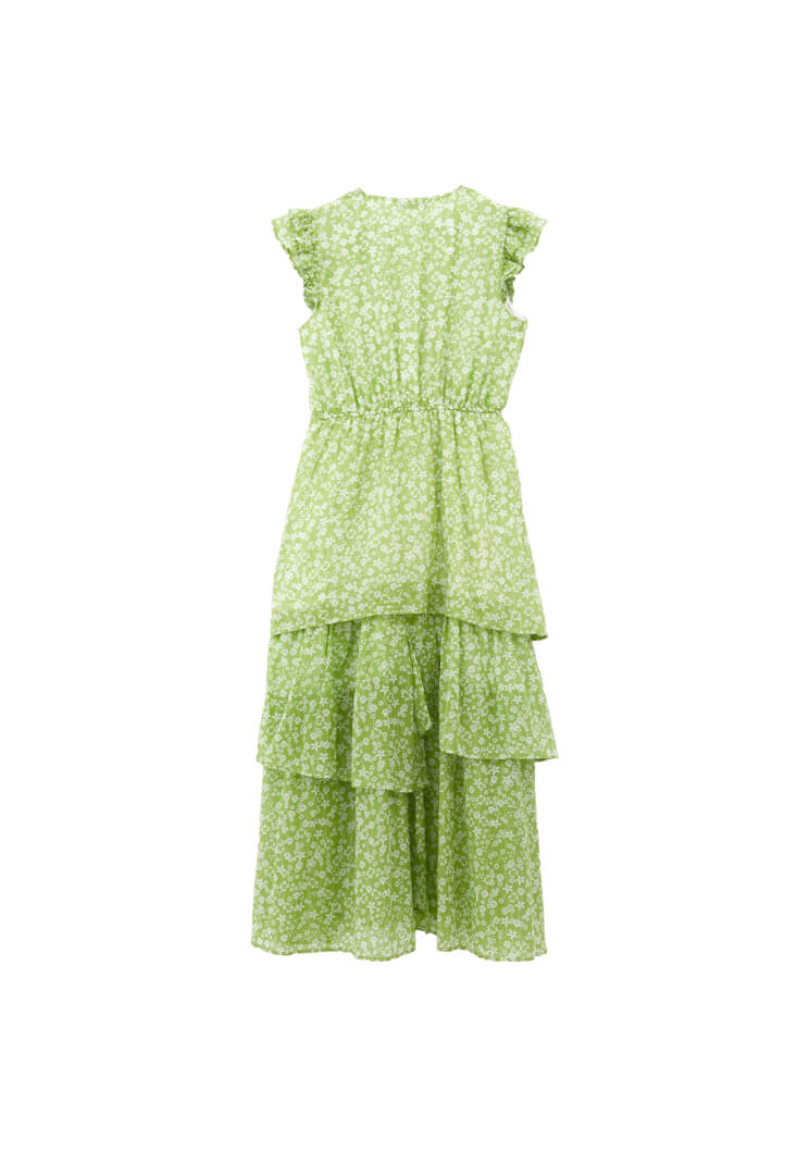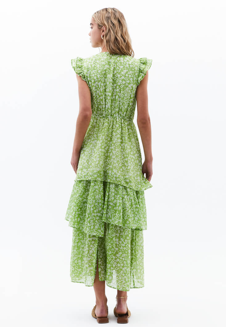 Renkli deseni ve hareketli fırfır detaylarıyla dikkat çeken bu uzun elbise, yaz stiline neşeli ve romantik bir hava katıyor. Hafif kumaşıyla gün boyu ferah bir kullanım sunarken, katlı etek ucu ve vücuda hafif oturan üst kısmıyla dengeli bir siluet yaratıyor.