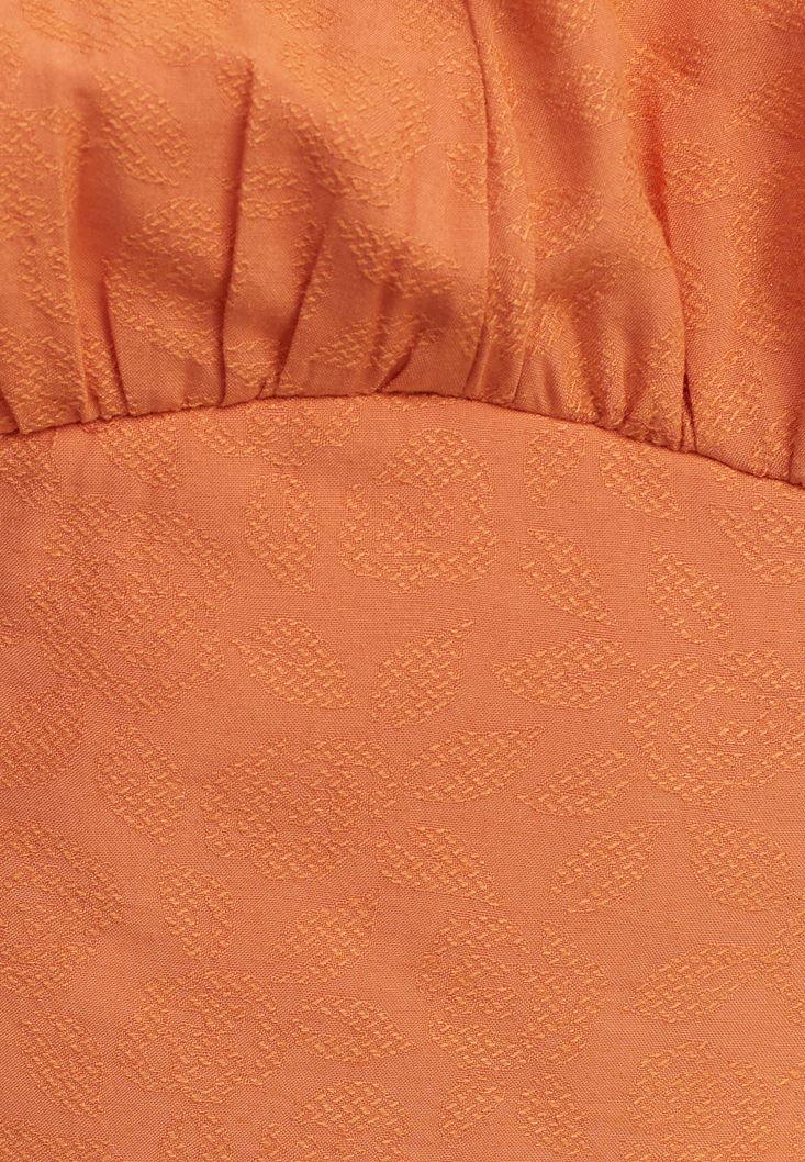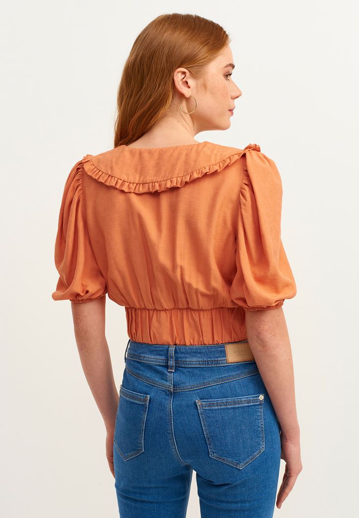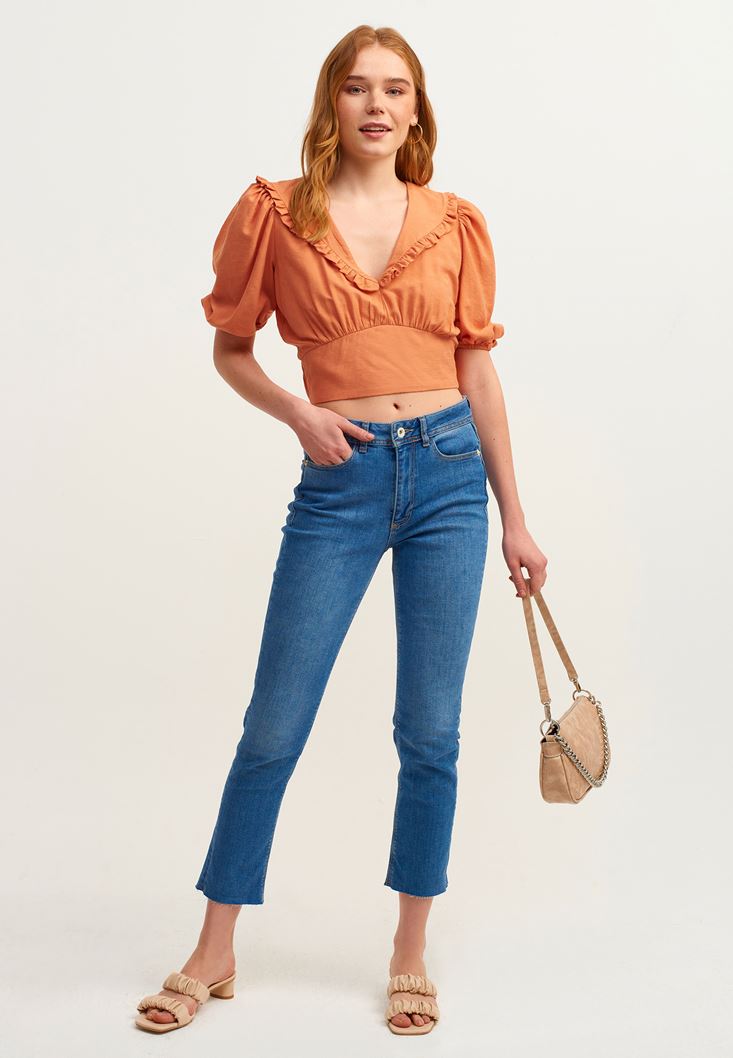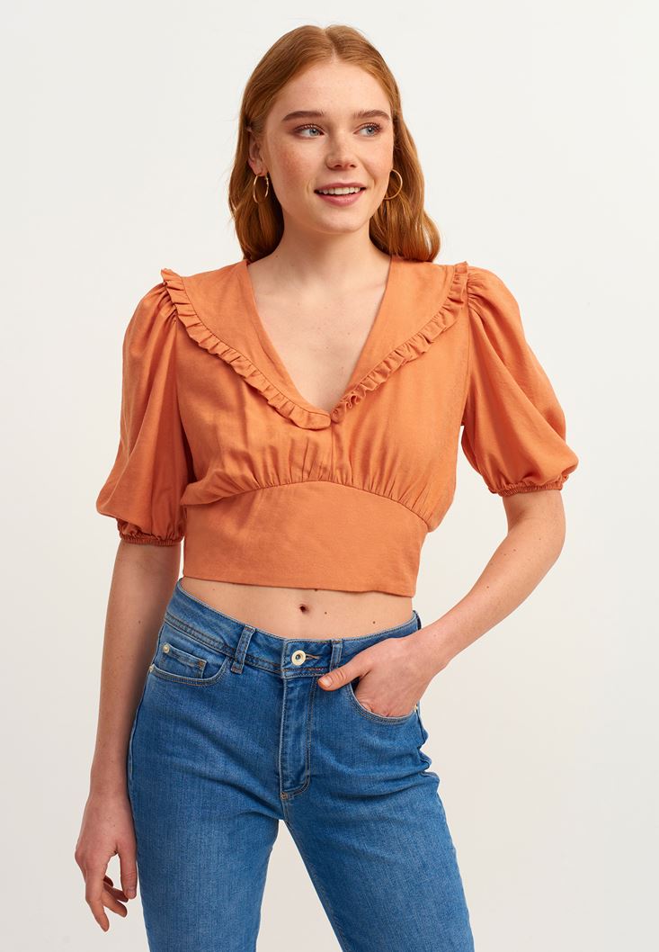 Turuncu Fırfırlı V-Neck Crop Bluz