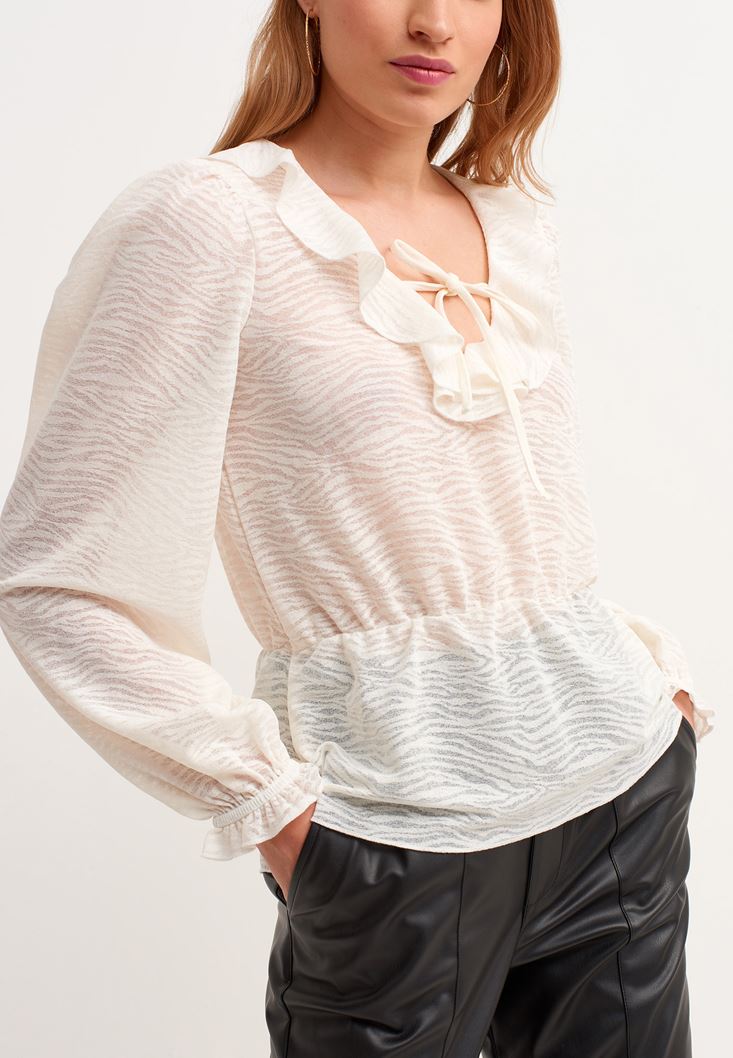 • Bayan Krem Fırfırlı V-Neck Romantik Bluz