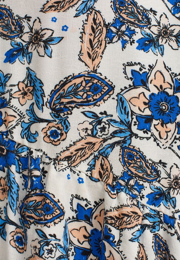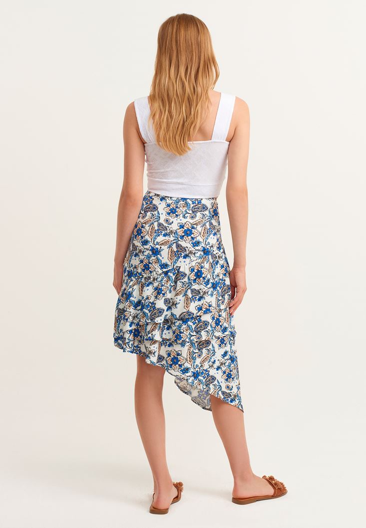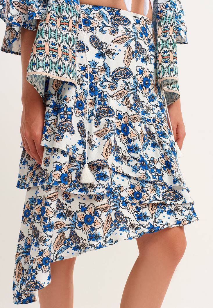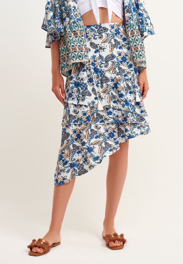 %100 viskon içerikli doku, asimetrik kesim, yüksek bel, floral desenli, katlı ve volanlı etek tasarımı.