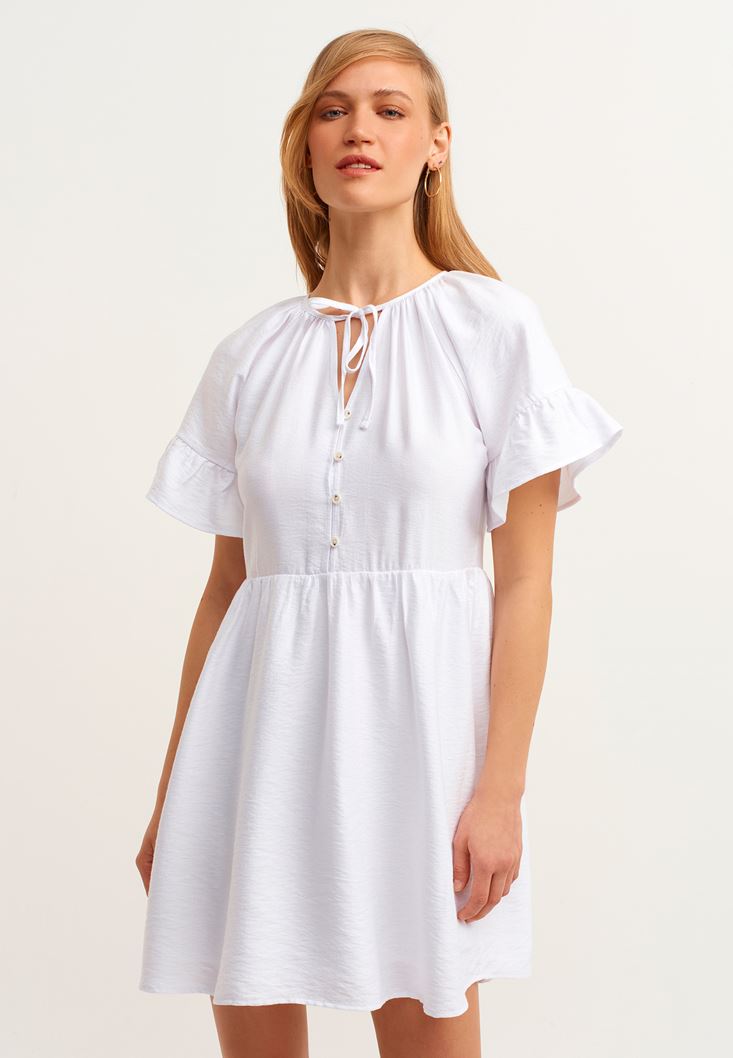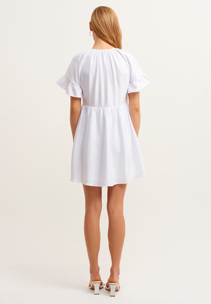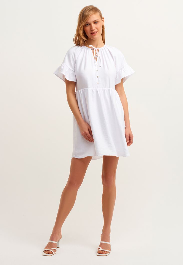 Beyaz Fırfırlı ve Düğmeli Mini Elbise