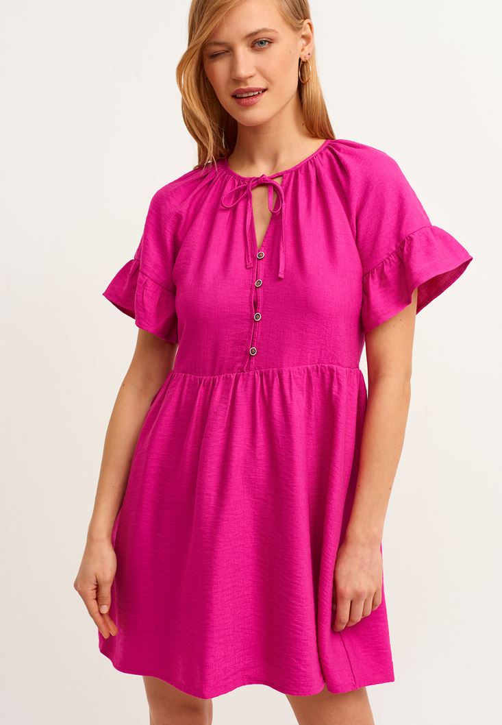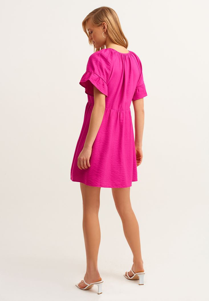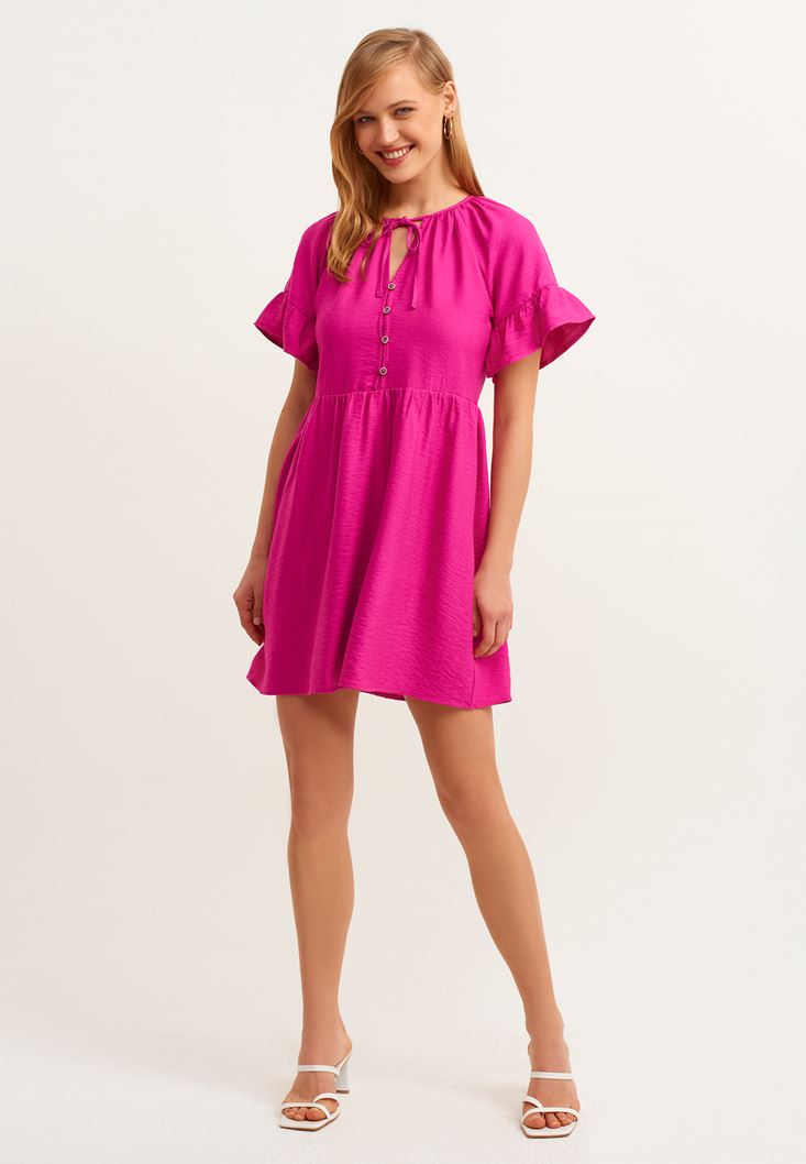Pembe Fırfırlı ve Düğmeli Mini Elbise