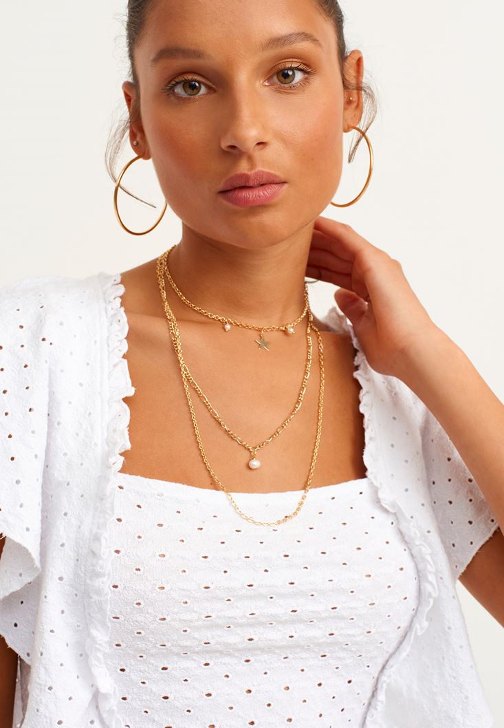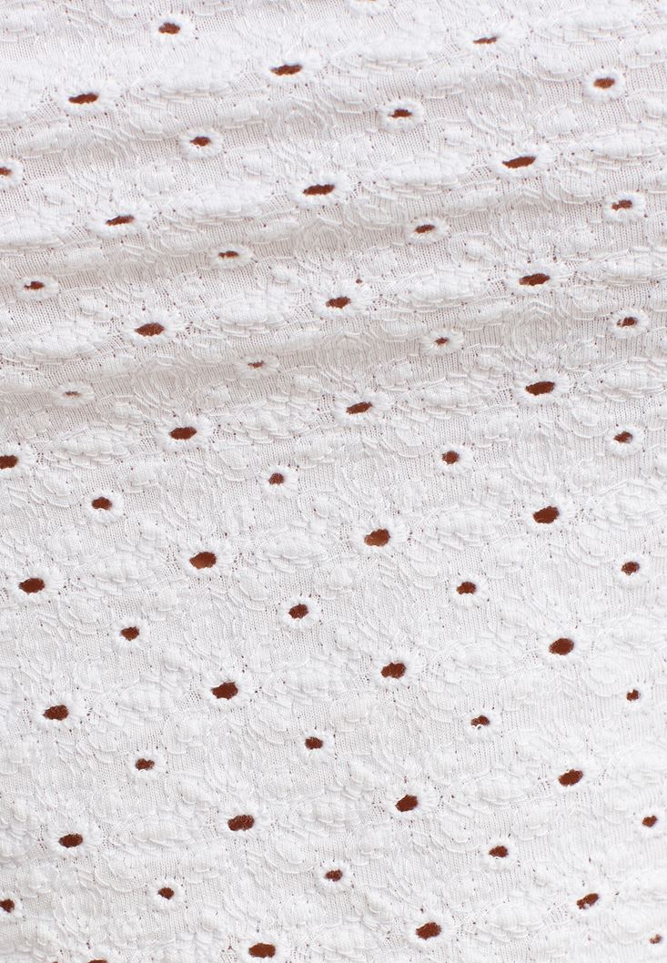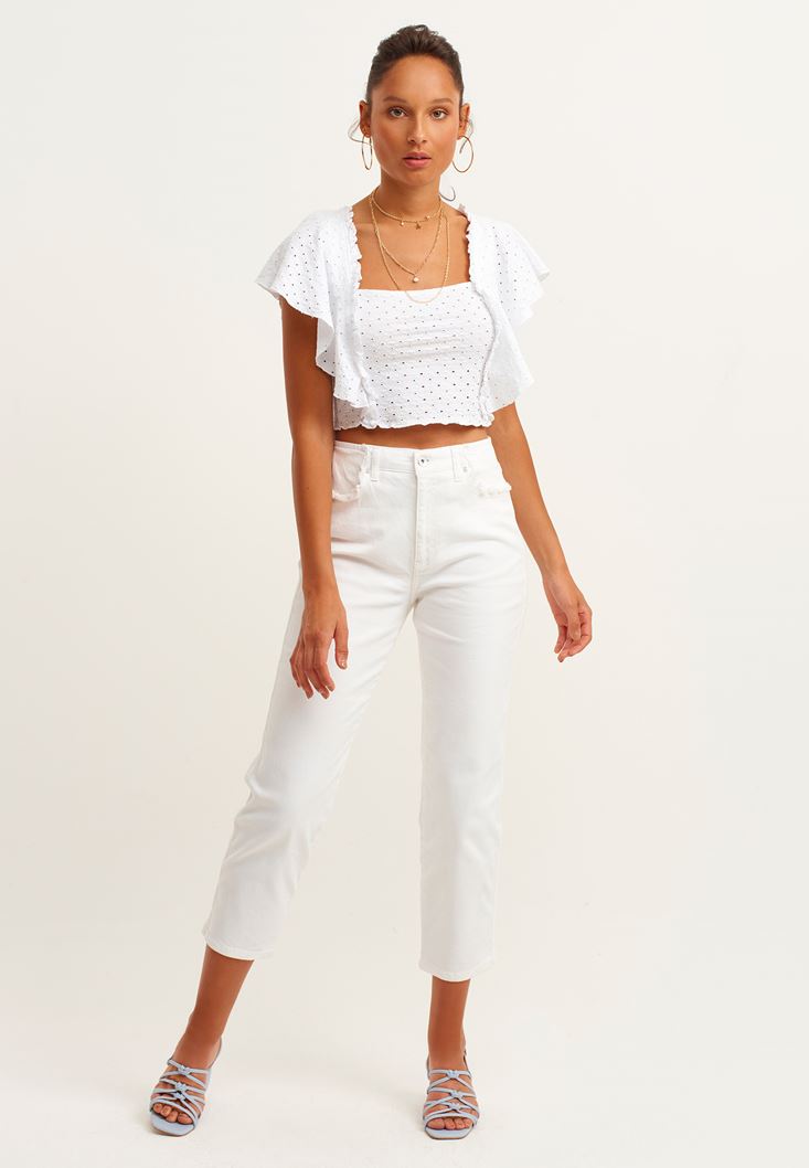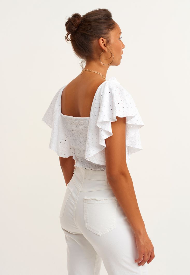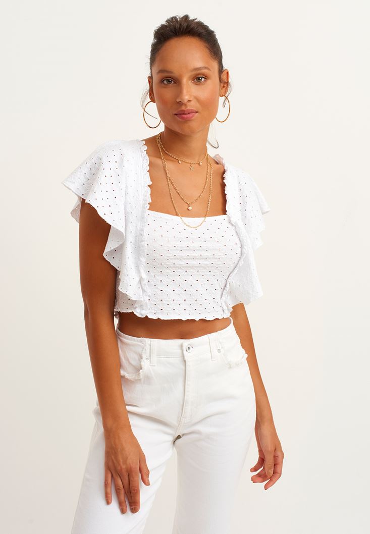 Beyaz Fırfırlı ve Nakışlı Crop Bluz
