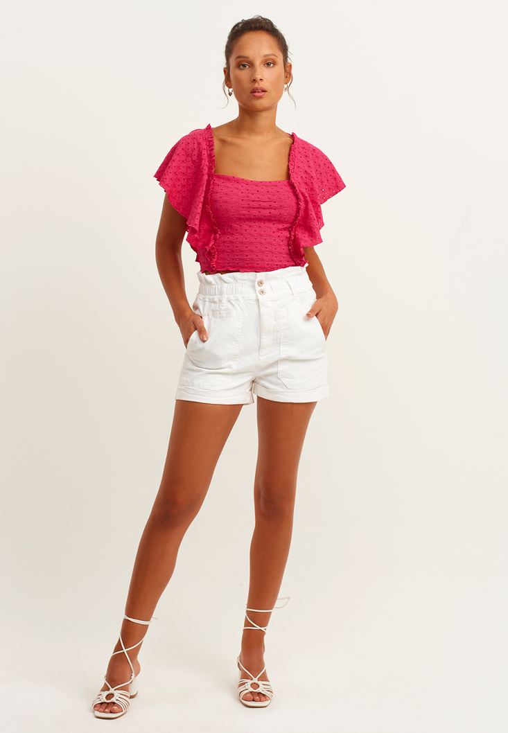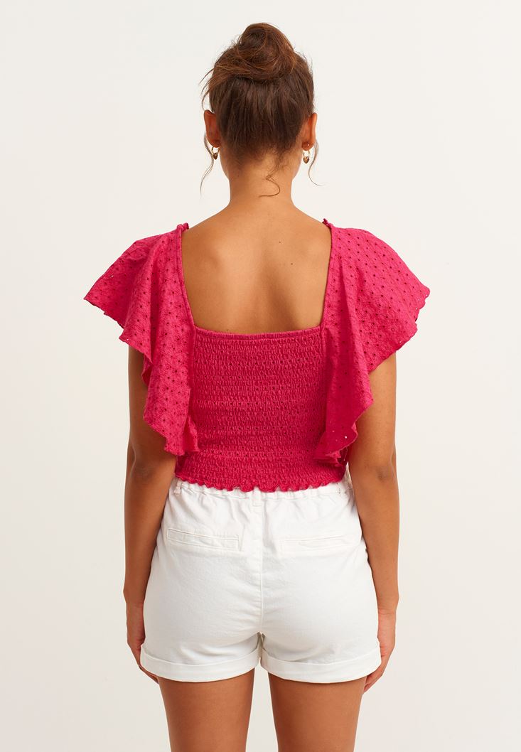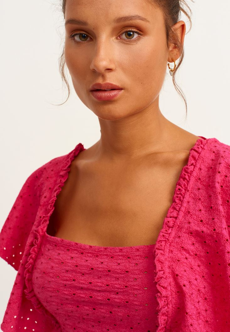 Pembe Fırfırlı ve Nakışlı Crop Bluz