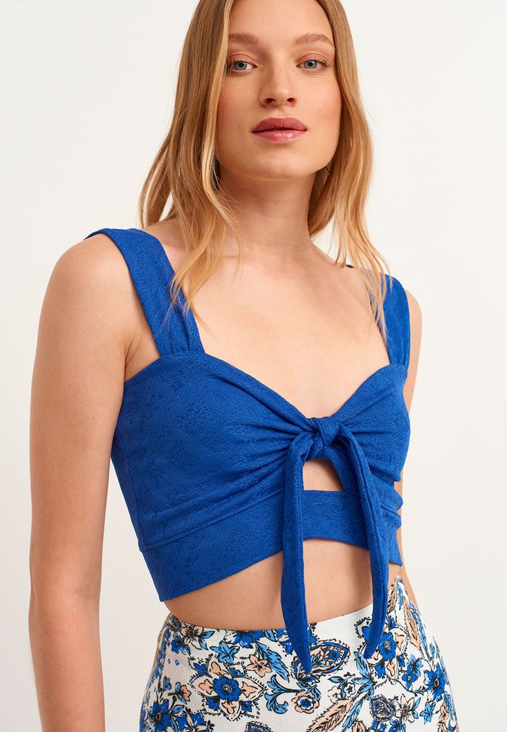 Bedeni saran rahat kalıp, kalın askılı, önü cut-out ve bağlamalı detaylı, kalın askılı, crop kesim.