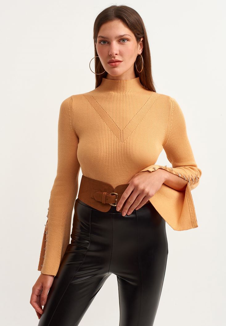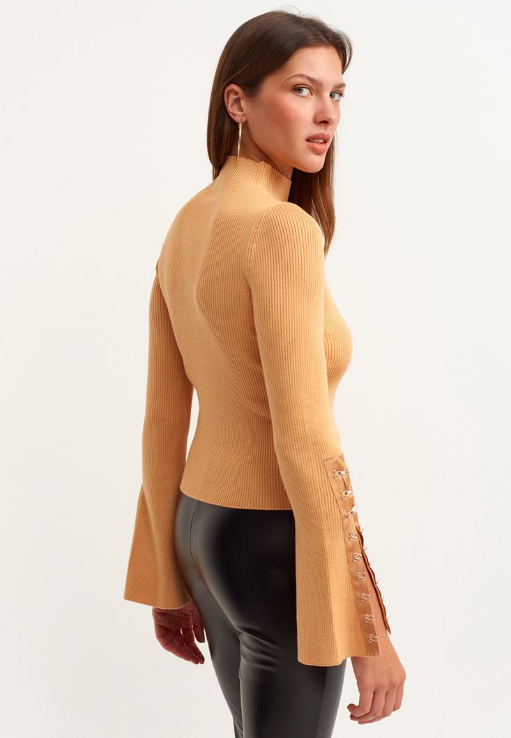 • Bayan Kahverengi Flare Kollu High-Neck Triko