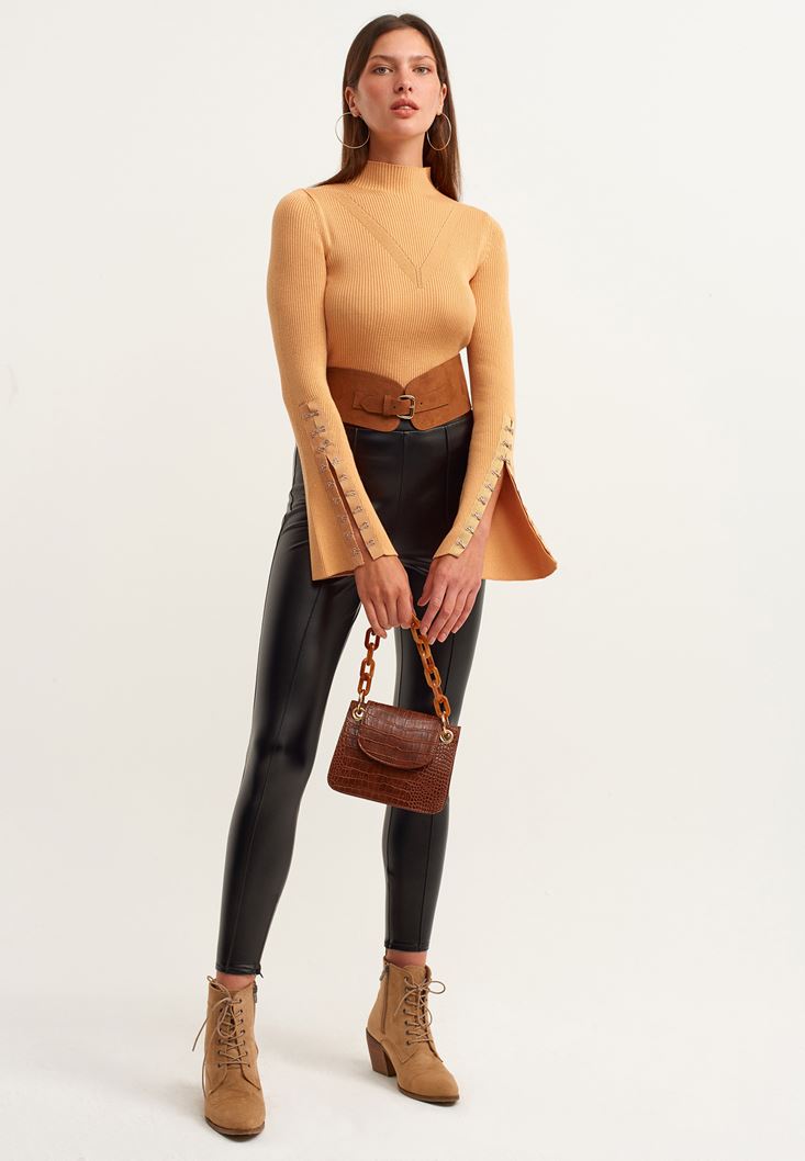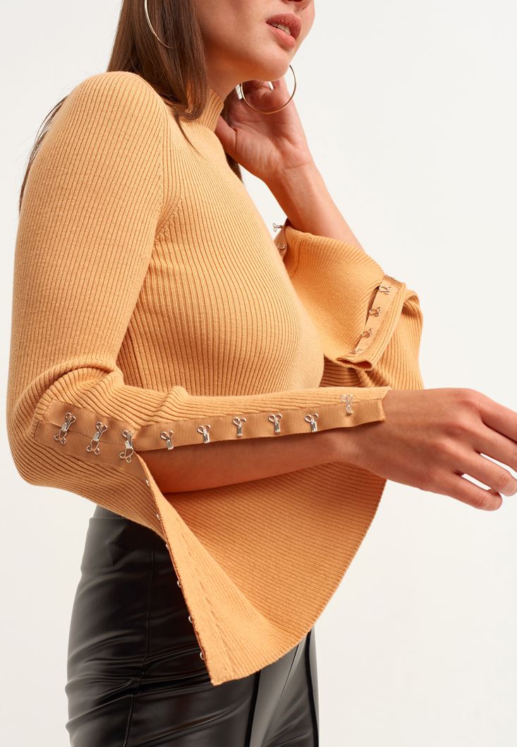 Pamuk karışımlı özel triko doku, yüksek yaka, ön kısmı motifli örgü, flare kollu ve kol yırtmacı aksesuar detaylı.