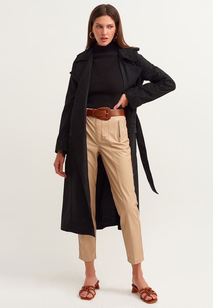 Pamuk karışımlı özel triko doku, yüksek yaka, ön kısmı motifli örgü, flare kollu ve kol yırtmacı aksesuar detaylı.