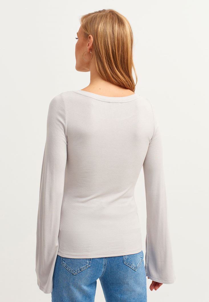 Viskon karışımlı özel doku, bot yaka, uzun flare kol detayı, bedene yakın rahat kalıp, esnek fitilli doku, standart boy.