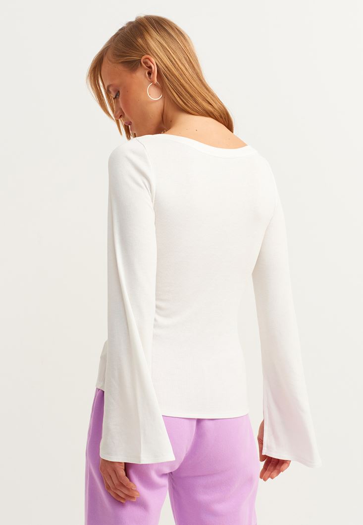 Viskon karışımlı özel doku, bot yaka, uzun flare kol detayı, bedene yakın rahat kalıp, esnek fitilli doku, standart boy.
