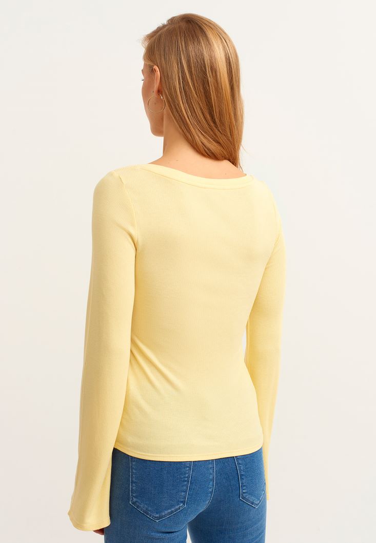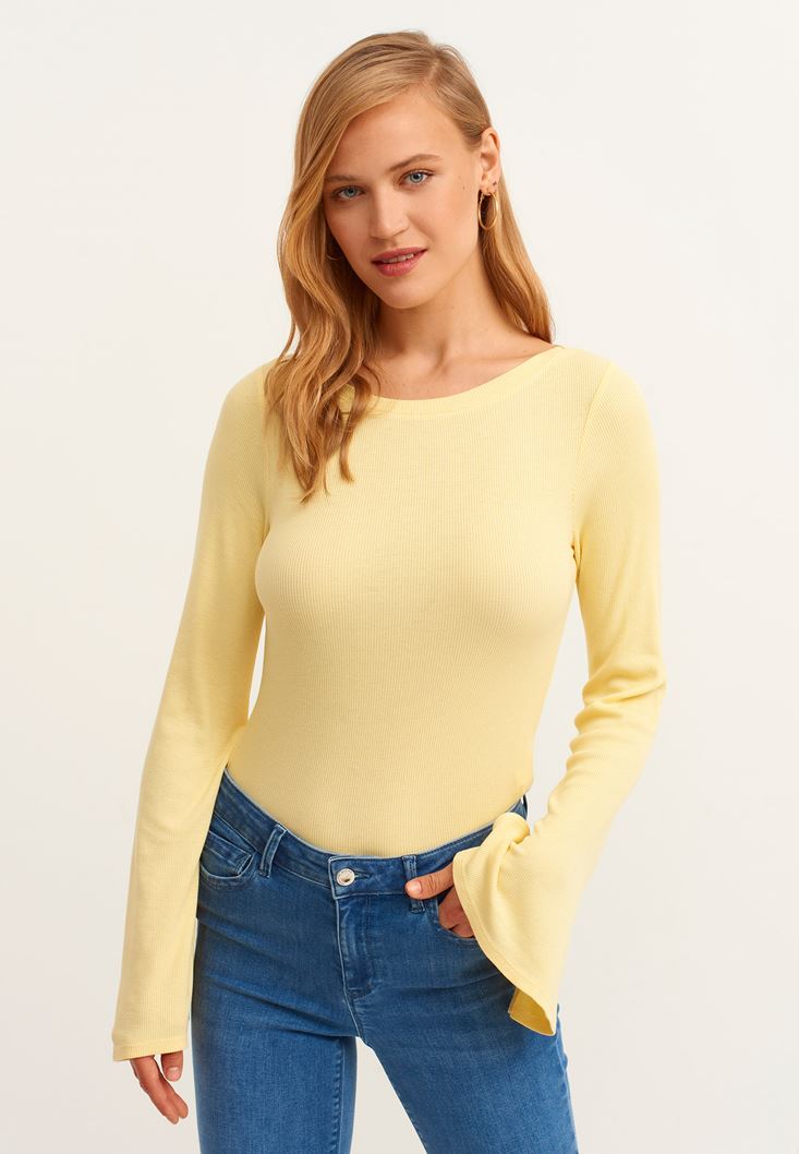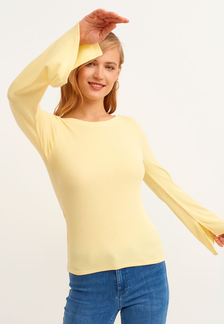 Viskon karışımlı özel doku, bot yaka, uzun flare kol detayı, bedene yakın rahat kalıp, esnek fitilli doku, standart boy.