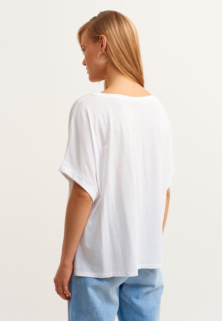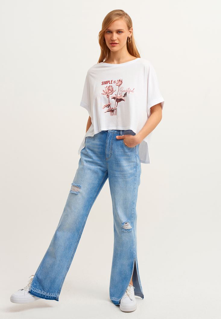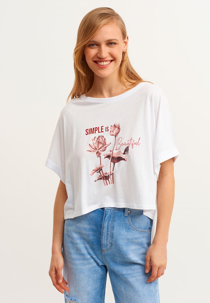 • Bayan Beyaz Floral Baskılı Asimetrik Tişört ( MODAL )