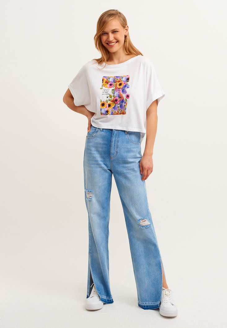 • Bayan Beyaz Floral Baskılı Asimetrik Tişört ( MODAL )