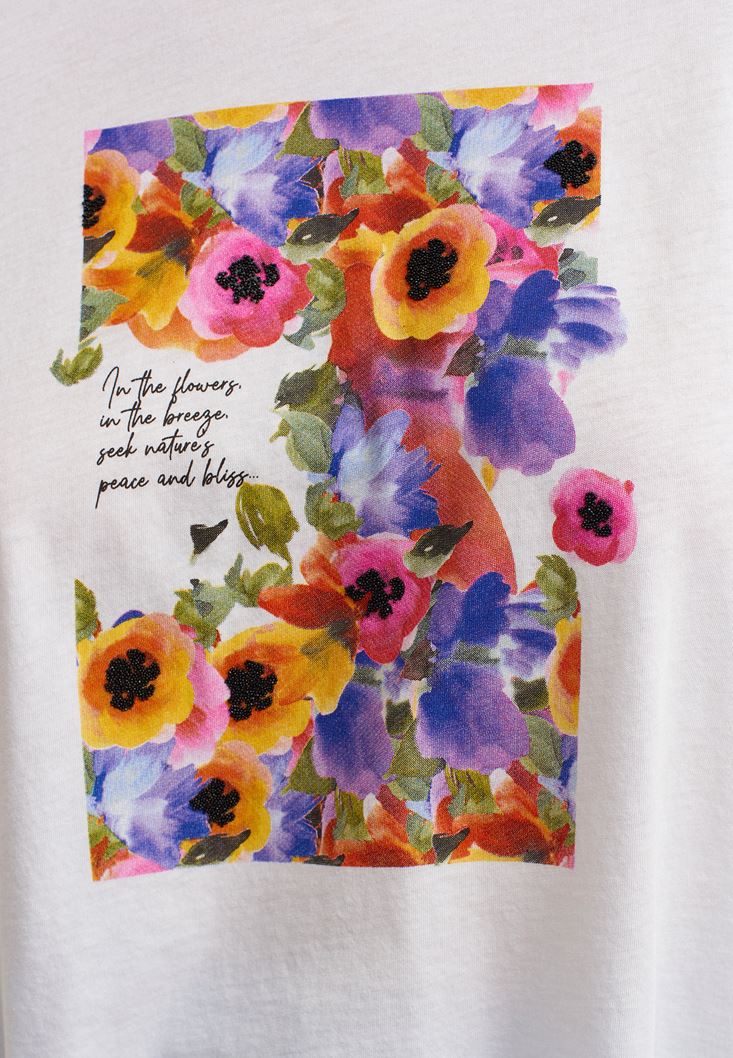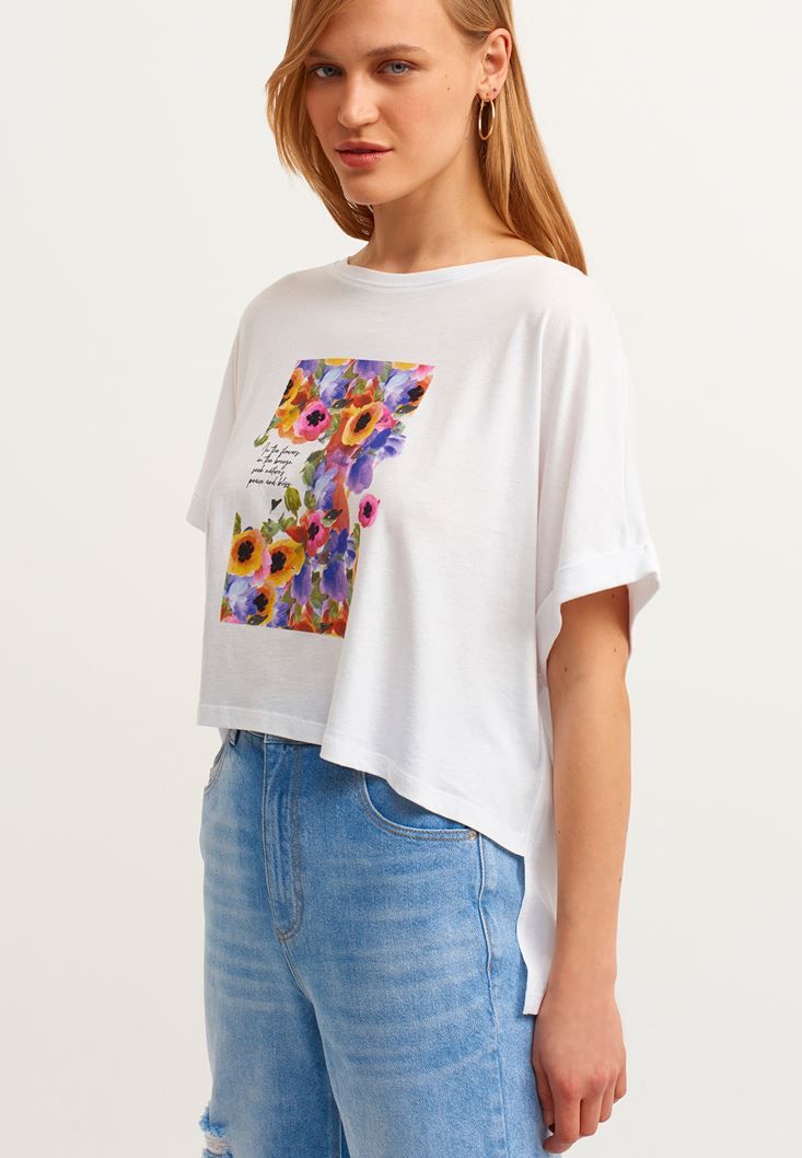 Beyaz Floral Baskılı Asimetrik Tişört ( MODAL )