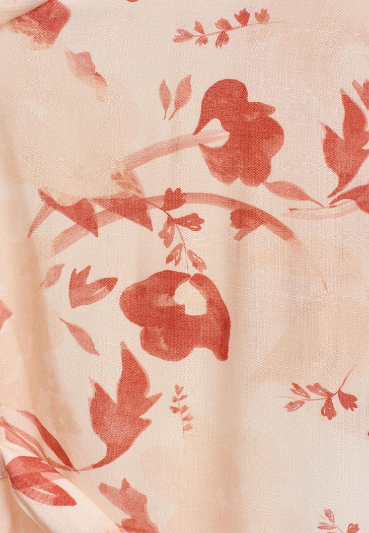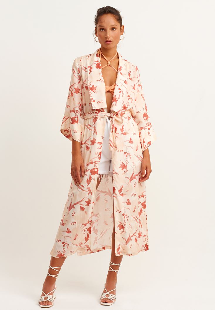 %100 viskon içerikli, iki yanı yırtmaçlı, floral desenli, şal yaka formlu, geniş kol duruşu, maxi boy, kendi kumaşından kuşaklı.