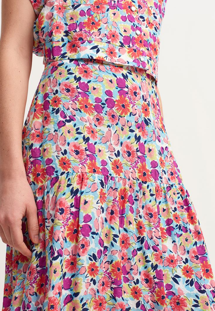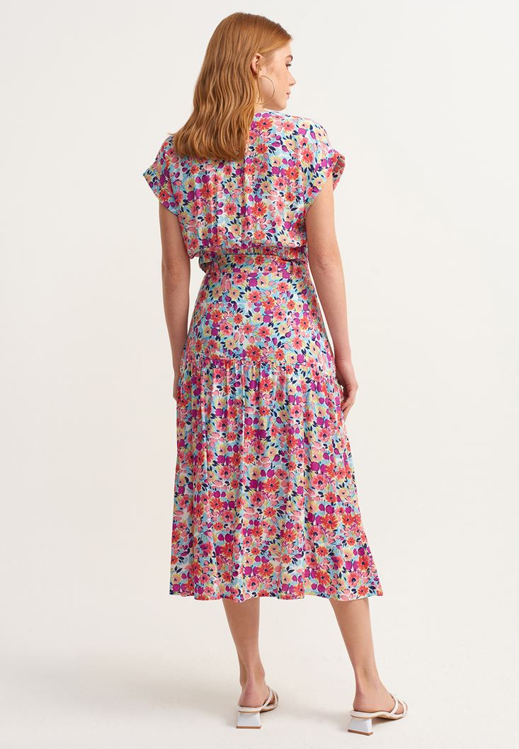 %100 viskon içerikli doku, çiçek desenli, midi boy, a-line fit, volanlı etek duruşu.