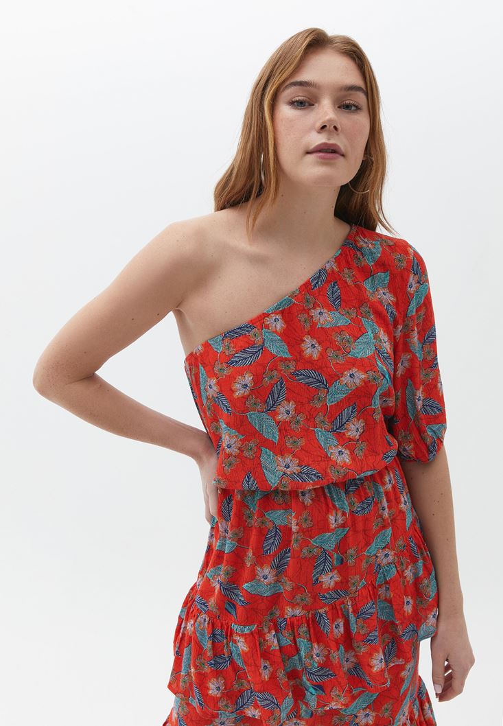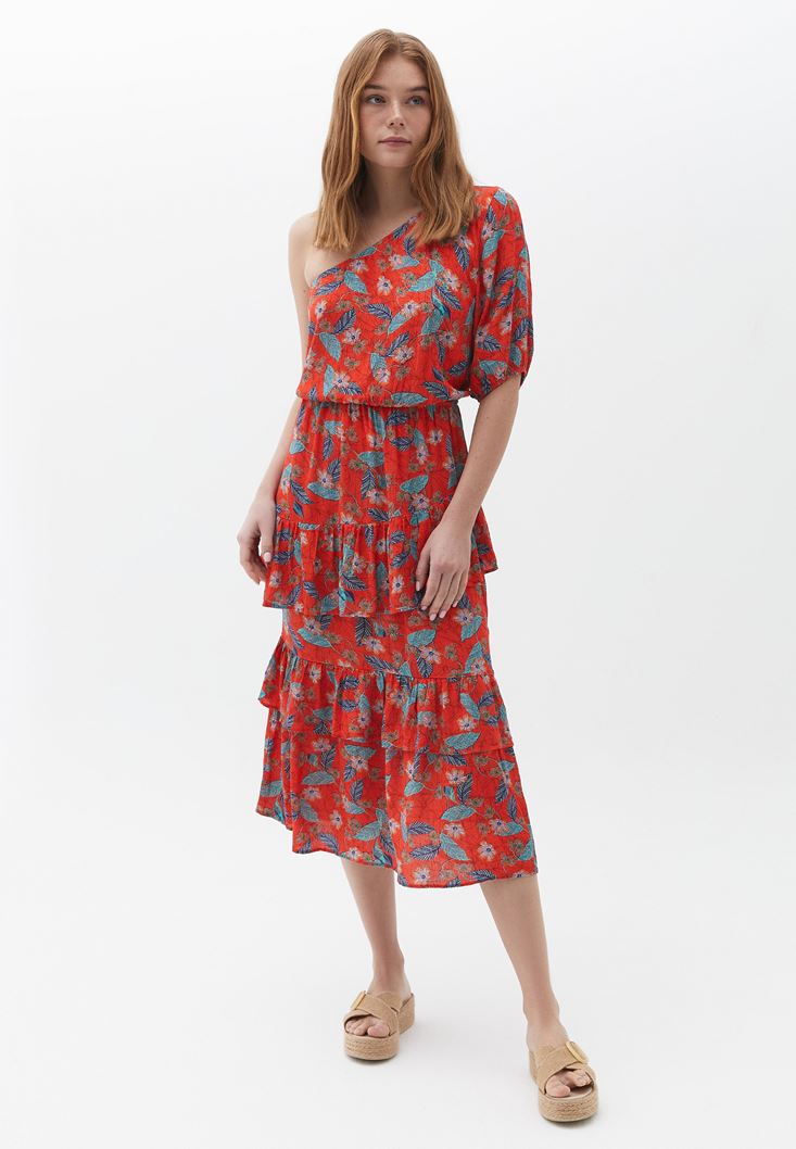 %100 viskon içerikli, tek omuz detaylı ve balon kollu, beli lastikli, etek boyunca katlı fırfırlar, floral desenli, maxi boy.