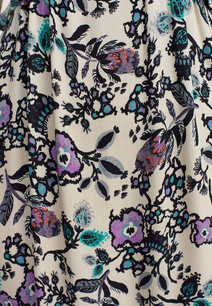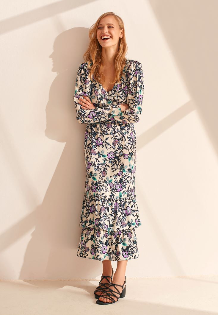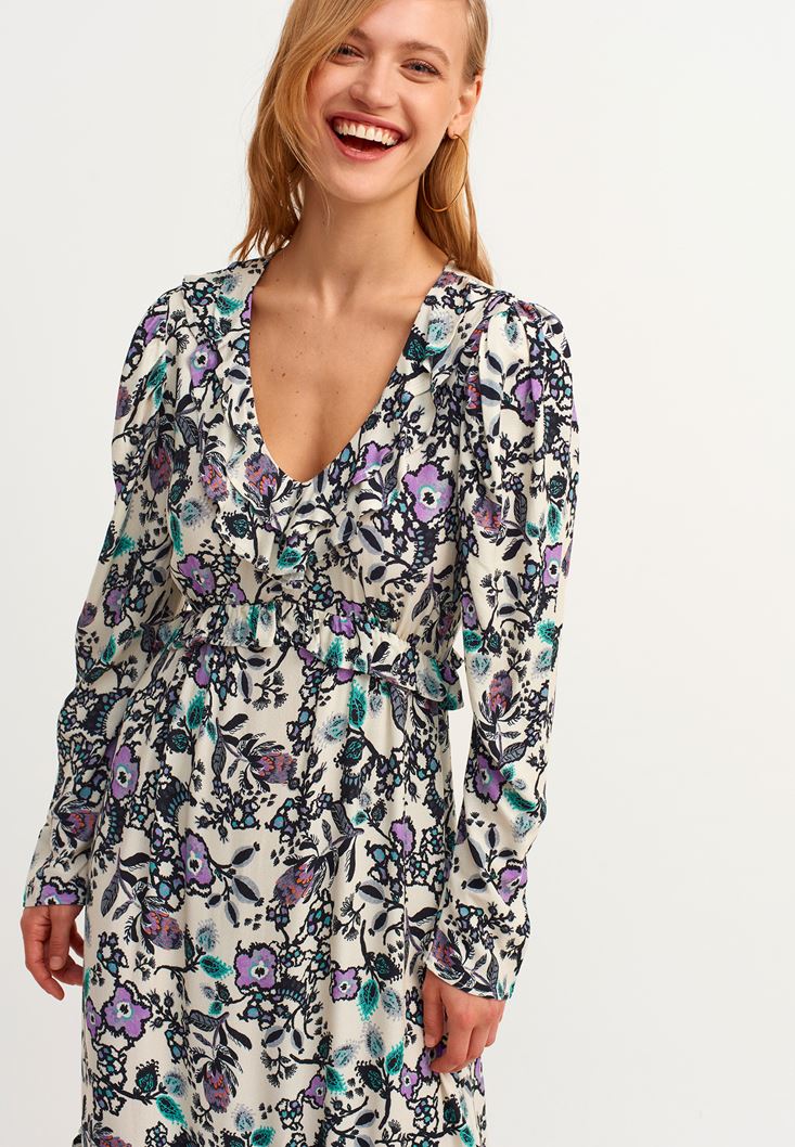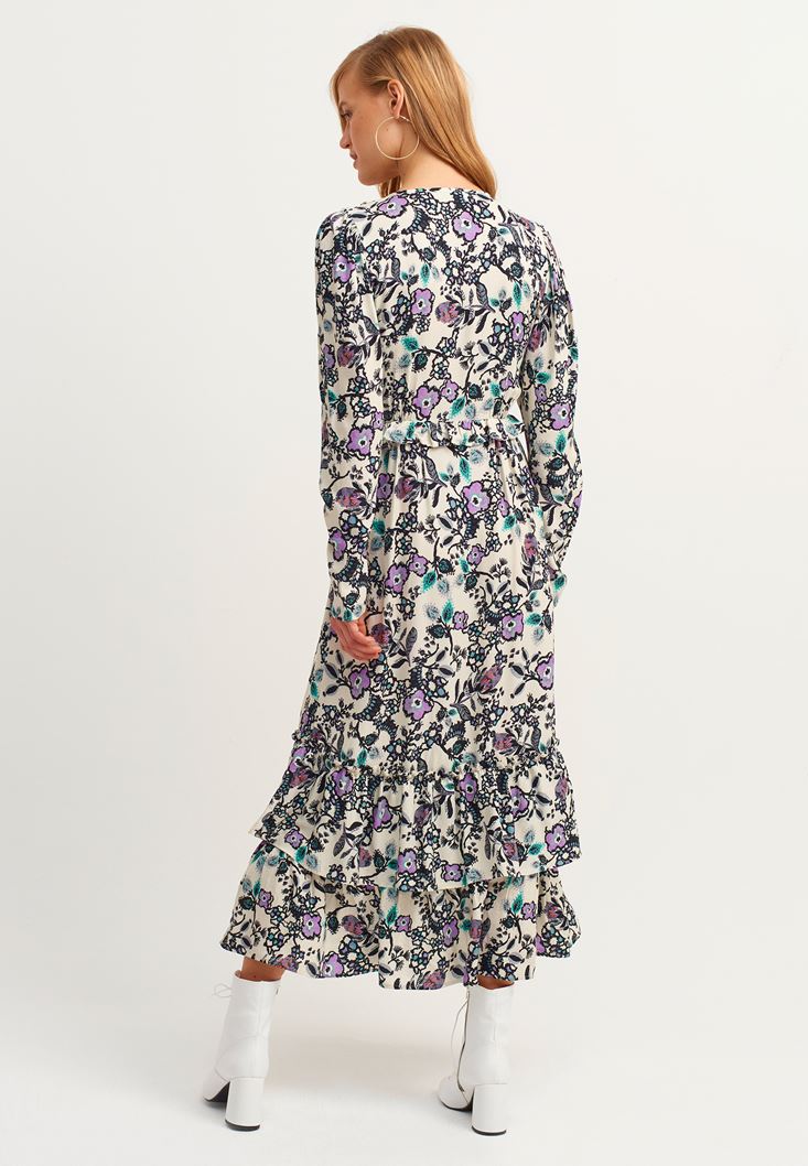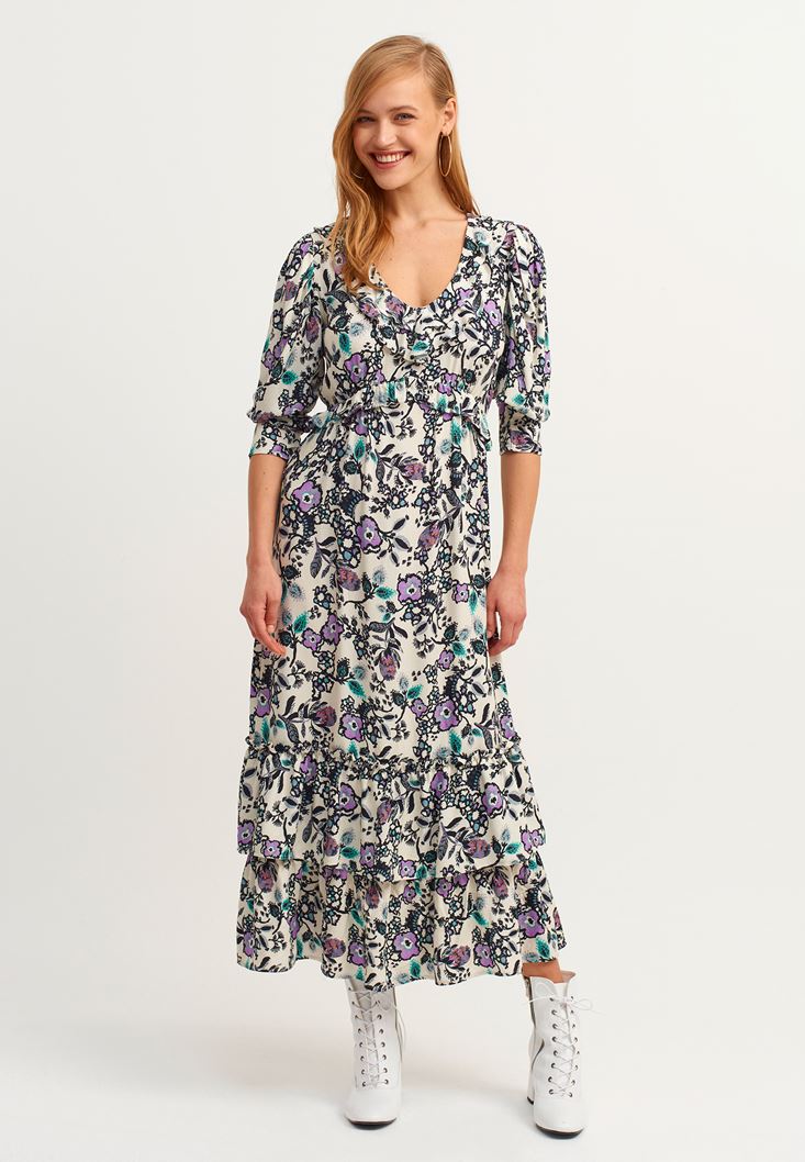 Doğayı çağrıştıran çiçek desenleri, V yaka form, bel, yaka ve etek uçları fırfırlı, yan gizli fermuar, maxi boy kesimi.